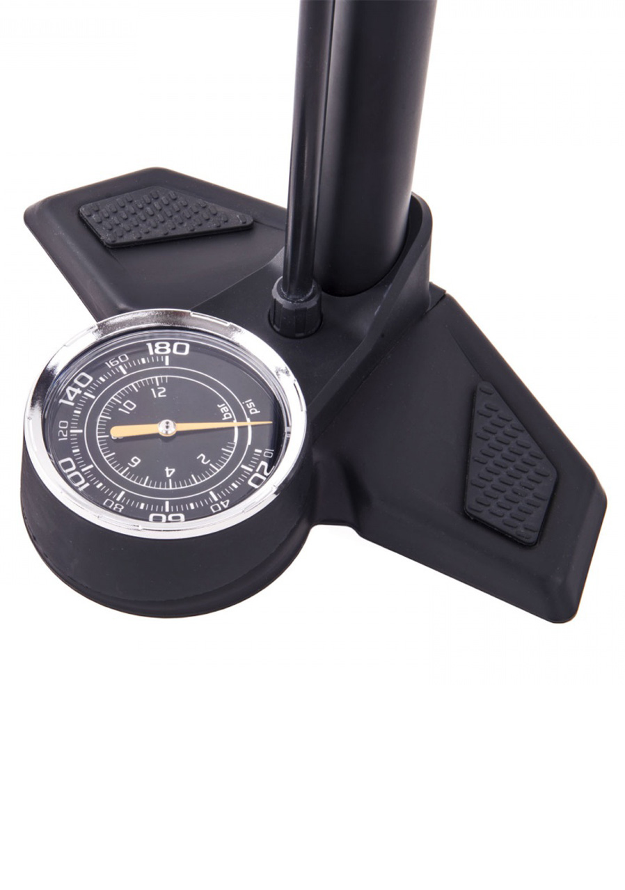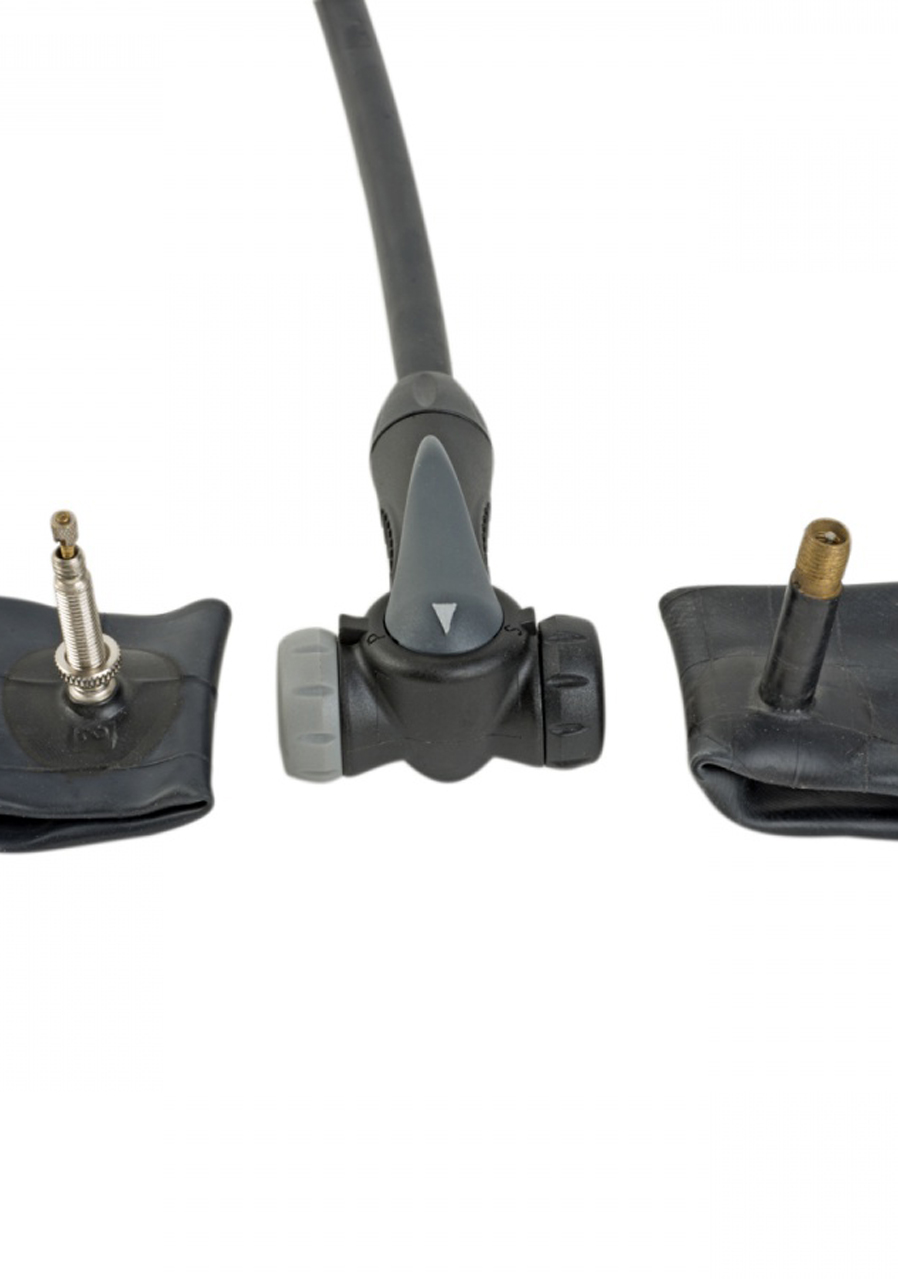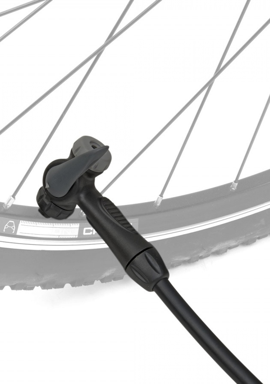 Hustilka je vybavená veľkým a prehľadným manometrom, ergonomickou rukoväťou a duálnou hlavicou kompatibilnou s ventilmi AV (autoventil) aj FV (galuskový ventil). Čierna farba dodáva elegantný a športový vzhľad.