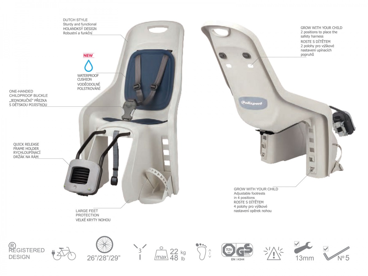 Špecifikácia: Montáž na rám – systém FF Nosnosť 9–22 kg Polstrovanie a nastaviteľné opierky nôh 3-bodový bezpečnostný pás Materiál odolný plast s UV ochranou Vetracie otvory na zadnej strane Farba biela/modrá Certifikácia EN14344