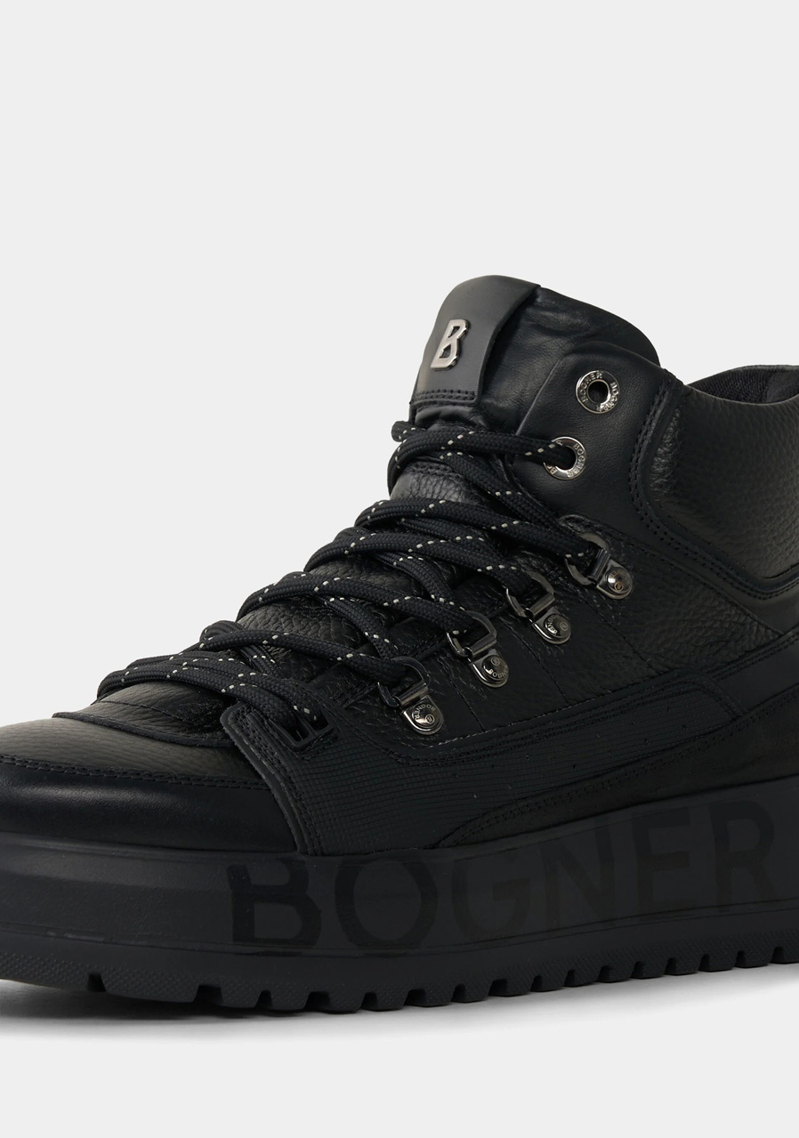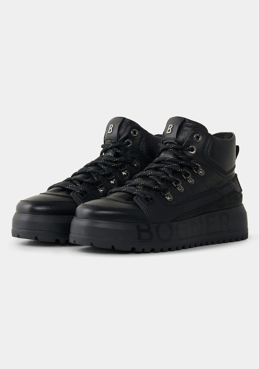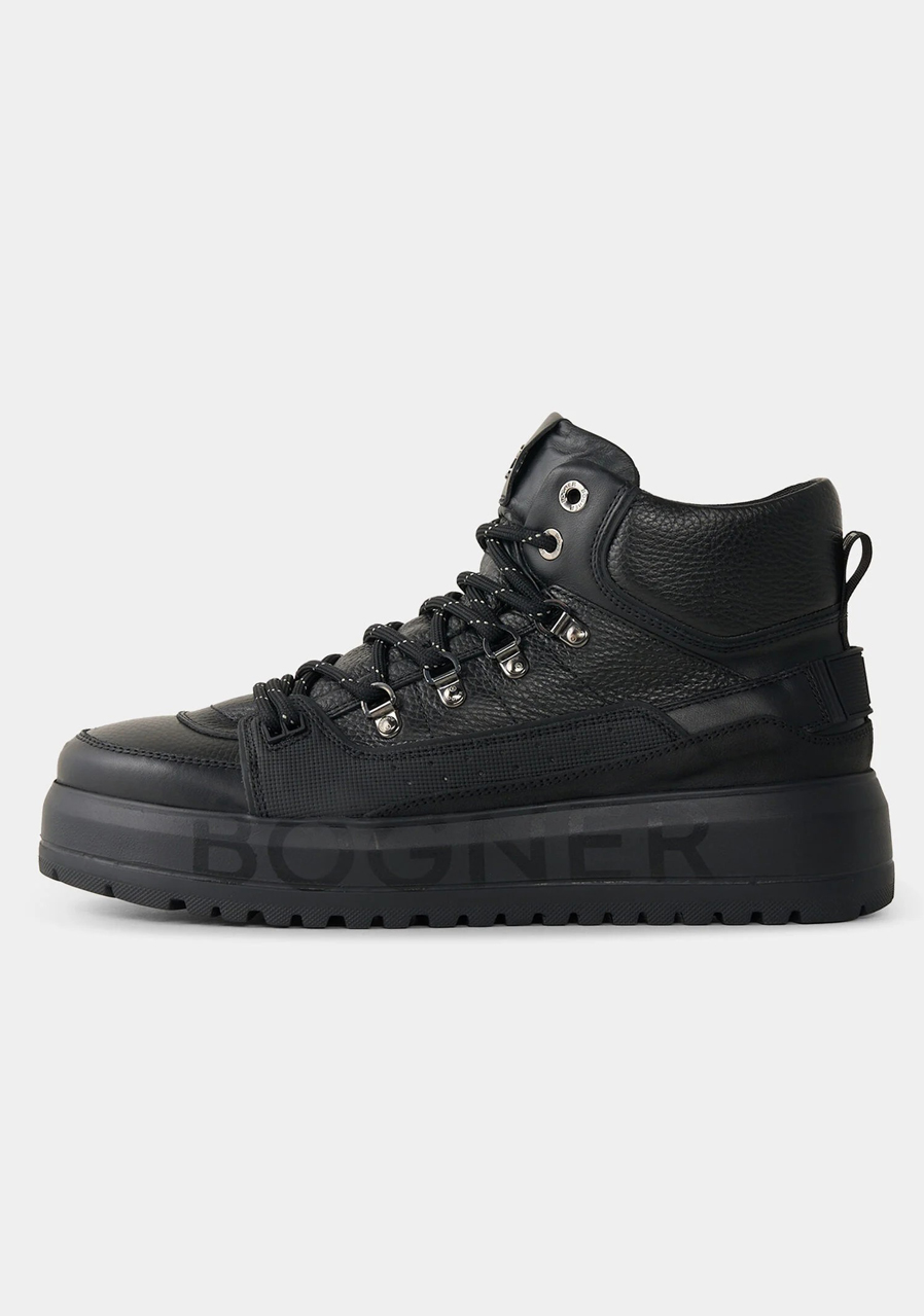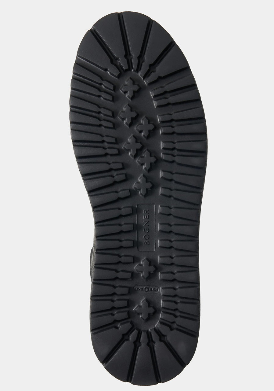 Svršok topánok tvorí kombinácia kvalitnej hladkej kože a technického textilu s vodoodpudivou úpravou, ktorá chráni pred vlhkosťou a znečistením. Vnútorná podšívka z mäkkého fleecu poskytuje teplo a pohodlie, zatiaľ čo mierne polstrovaný jazyk a vyberateľná stielka zvyšujú komfort aj pri dlhšom nosení. Robustná gumová podrážka s hlbokým vzorom zabezpečuje dobrú trakciu a stabilitu na klzkých povrchoch. Elegantné detaily, ako tónované logo Bogner a kvalitné šnurovanie s kovovými očkami, podčiarkujú exkluzívny charakter tejto obuvi.
