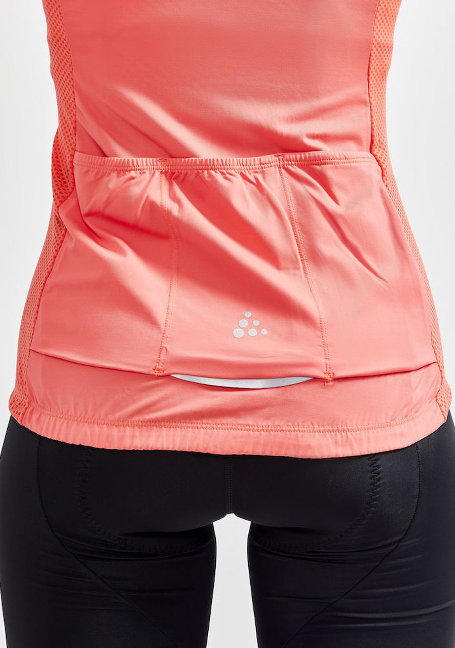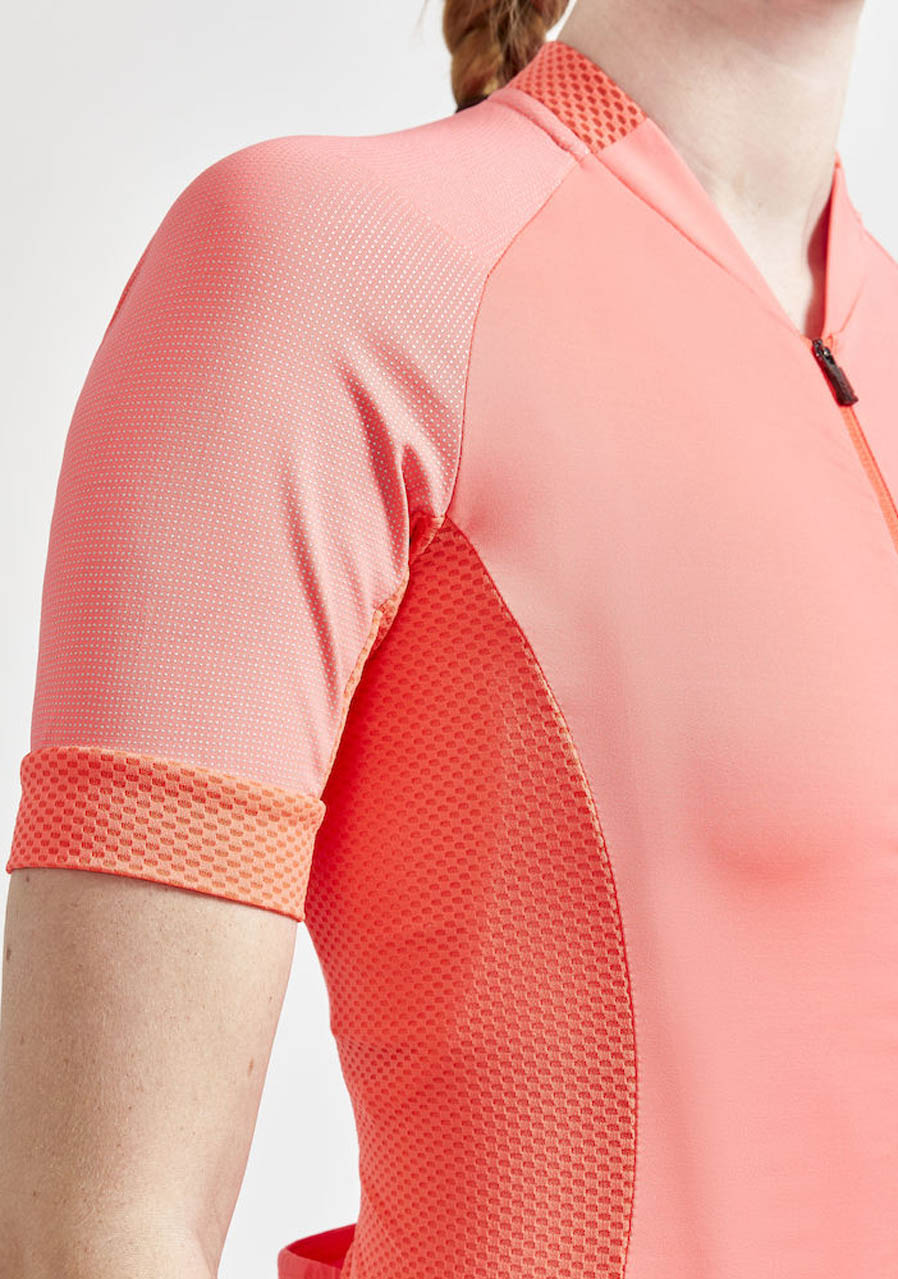 Dámský, technicky propracovaný cyklistický dres CRAFT ADV Endur Lumen s výrazným reflexním potiskem na rukávech. Materiál: 92% recyklovaný polyester, 8% elastan; 100% polyester - výborný odvod potu, rychleschnoucí, chladivý efekt - výrazné reflexní ošetření rukávů - ergonomický střih - meshové panely na bocích - dlouhý zip podložený légou - speciální tvarování límce v oblasti zátylku pro vyšší komfort při jízdě - ve spodní části vzadu stažení do gumy se silikonovým potiskem z vnitřní strany - v zadní části trojdílná kapsa se skrytou kapsičkou na zip (z boku)