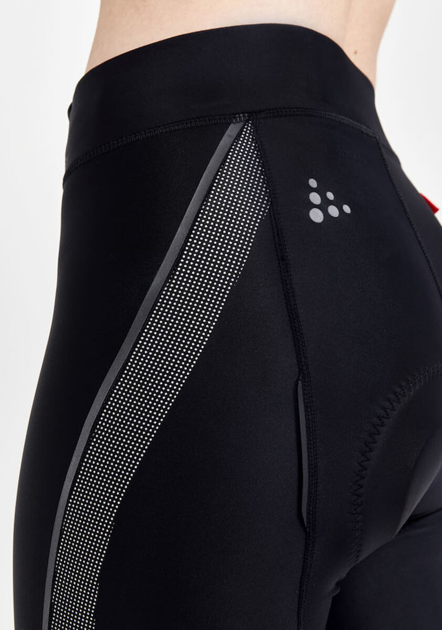 ergonomický strih a ploché švy silikónový potlač na konci nohavíc zabraňuje vyhrnovaniu silné reflexné prvky pre vyššiu bezpečnosť cyklistická vložka Craft Infinity C2: elastická, bezšvová, antibakteriálna, anatomická výstelka: sedacia časť – 12 mm, stred – 8–10 mm, okraje – 3 mm hustota peny: 60–80 kg/m³ materiál: 78 % recyklovaný polyamid, 22 % elastan
