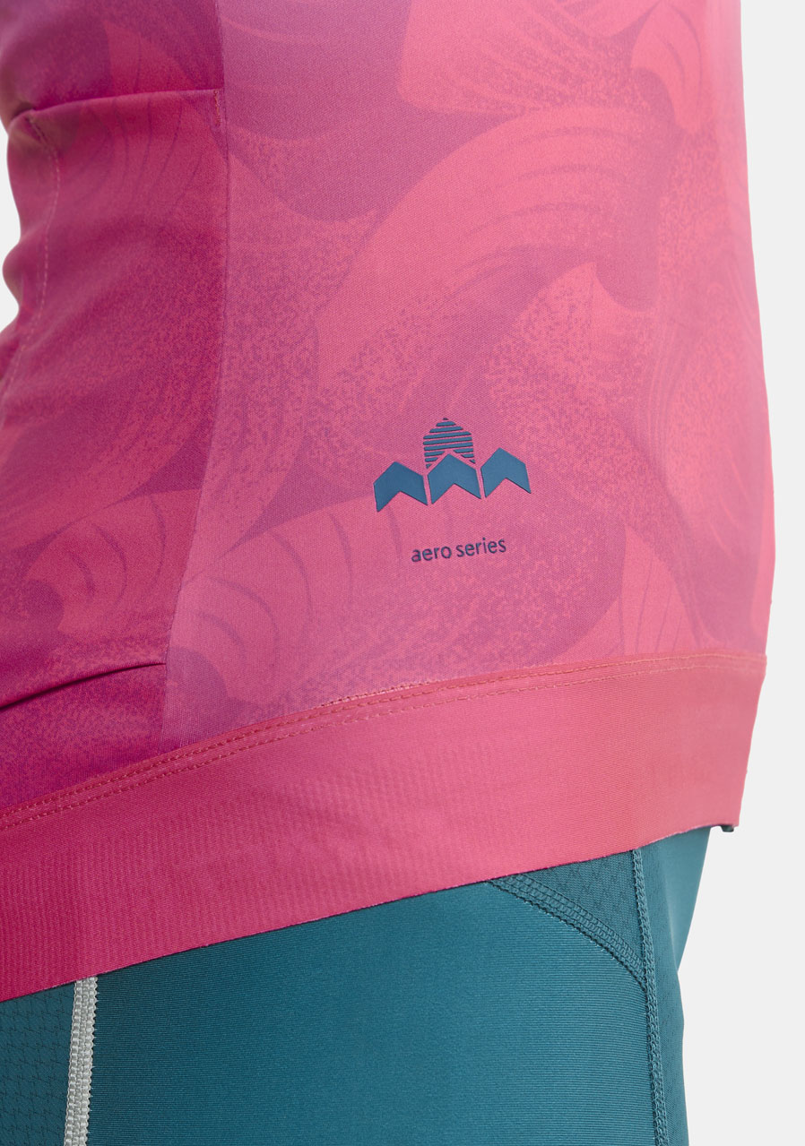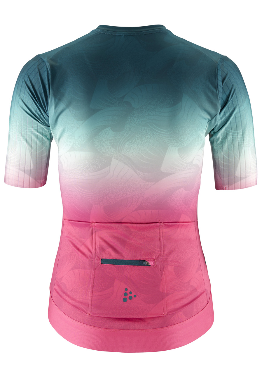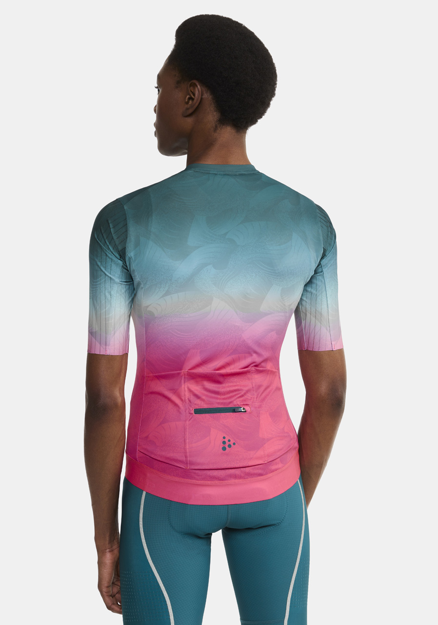 Rukávy s kanálovou štruktúrou znižujú odpor vzduchu, zatiaľ čo tvarovaný golier a predĺžený zadný diel poskytujú pohodlie a optimálnu pozíciu pri jazde. Silikónová guma v páse zabezpečuje, že dres zostáva na svojom mieste.