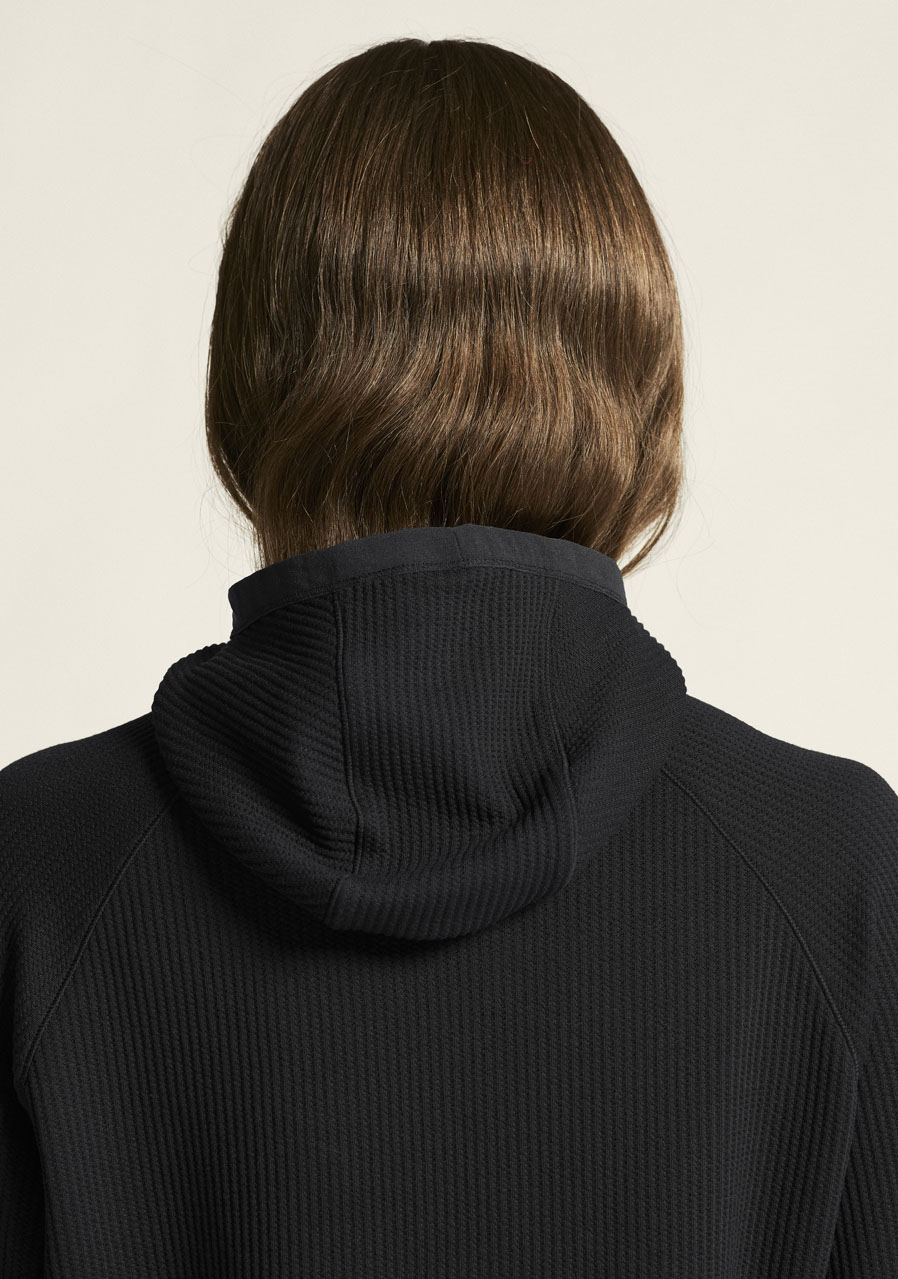 Parametre: Materiál : 92% recyklovaný polyester, 8% elastan Strih : priliehavý (slim fit) Zips : krátky 1/2 zips pri krku Kapucňa : priliehavá, anatomicky tvarovaná Vlastnosti : hrejivá, pružná, priedušná, rýchloschnúca, ľahká Farba : 999000 – čierna