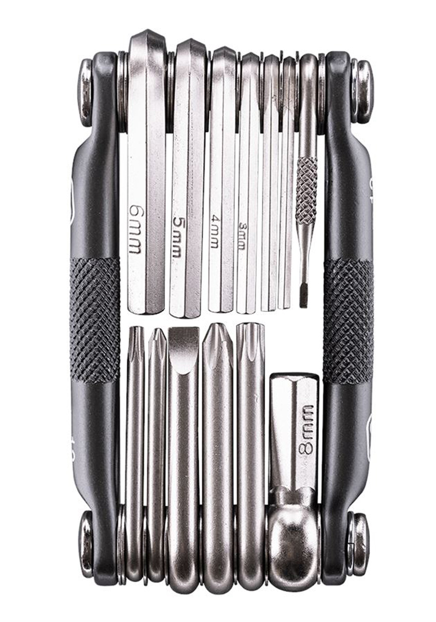 Hlavné vlastnosti: Integrovaný knotovač na rýchlu opravu bezdušových plášťov Úložný priestor na náhradné knoty a rýchlospojku reťaze Ľahká a pevná konštrukcia z hliníka 6061 T6 Sedem imbusových kľúčov 2 / 2,5 / 3 / 4 / 5 / 6 / 8 mm Tri skrutkovače dva krížové a jeden plochý Torx T10 a T25 Hmotnosť 164 g