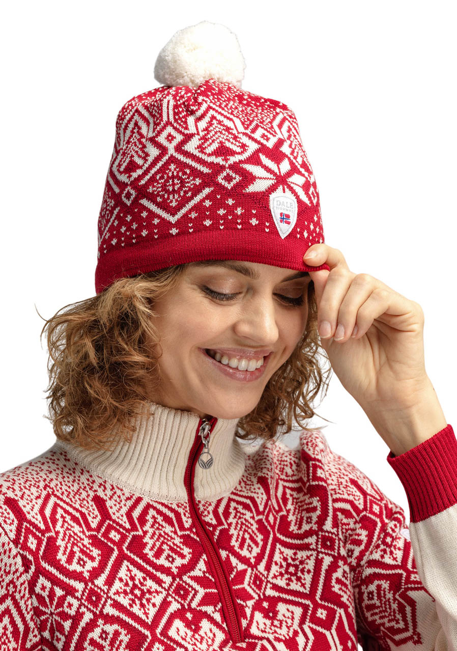 Táto štýlová zimná čiapka z kolekcie Dale of Norway vo farbách Raspberry/Off-White/Redrose spája tradičný nórsky vzor s prémiovým materiálom. Čiapka je pletená v Nórsku a ponúka vynikajúci termický komfort vďaka 100% mäkkej merino vlne, s podšívkou z ešte jemnejšej extra-fine merino vlny pre lepšiu tepelnú izoláciu, cirkuláciu vzduchu a pohodlie.