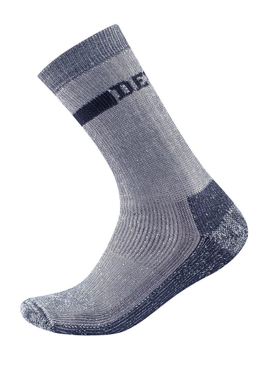 Devold Outdoor Merino Heavy Sock Navy Melange sú hrubšie a teplejšie ponožky navrhnuté špeciálne na trekking a turistiku. Vďaka vysokému obsahu merino vlny poskytujú výnimočnú tepelnú izoláciu a termoregulačné vlastnosti, ktoré vás udržia v teple aj vo vlhkých podmienkach. Nylonové vlákna po celom povrchu zvyšujú odolnosť proti mechanickému opotrebovaniu, zatiaľ čo elastické rebrovanie a komfortný lem držia ponožku pevne na nohe bez skĺzavania.
