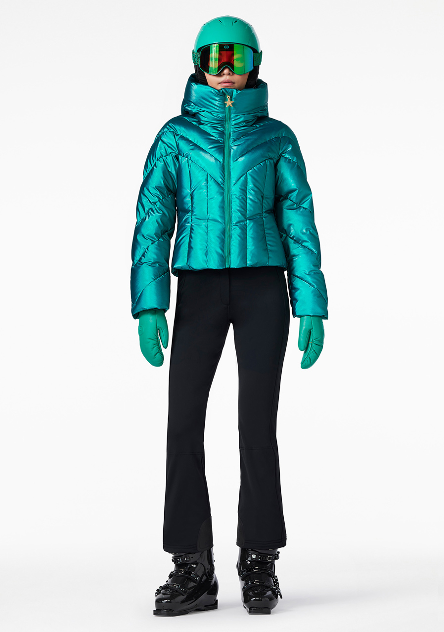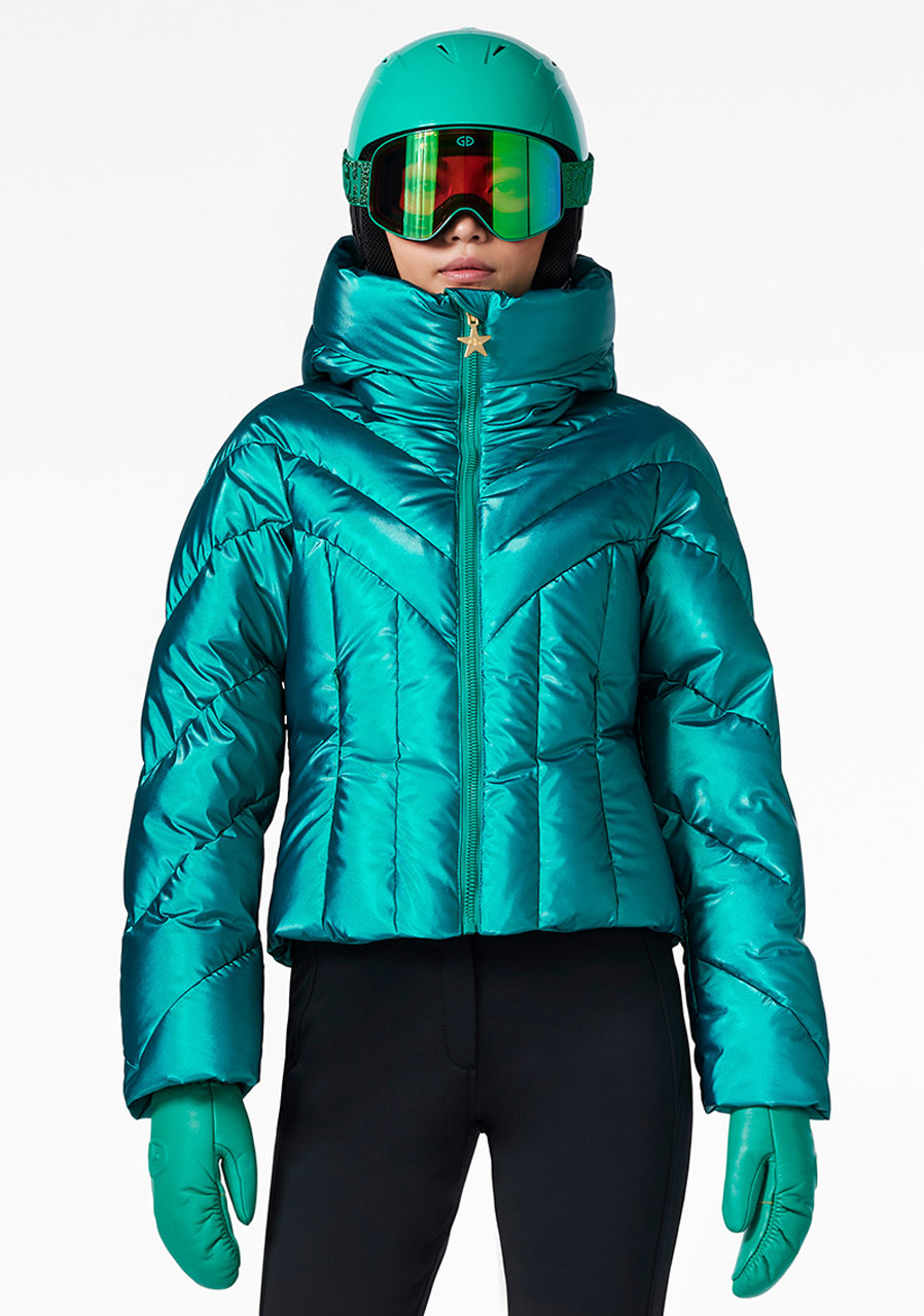 Goldbergh Elodie Ski Jacket v modrej farbe je luxusná a funkčná lyžiarska bunda, ktorá vyniká štýlovým dizajnom aj praktickými vlastnosťami. Vyrobená je z kvalitných materiálov kombinujúcich polyuretán a polyester, ktoré poskytujú odolnosť proti vetru a vode. Vnútri bundy sa nachádza teplá výplň z kačacieho páperia, čo zaručuje vynikajúcu tepelnú izoláciu aj v najchladnejších podmienkach. Bunda je navyše vybavená priedušnou podšívkou a je strihaná (regular fit strih) tak, aby umožnila voľný pohyb počas športových aktivít. Jej zlatý metalický vzhľad dodáva elegantný a sofistikovaný nádych, zatiaľ čo praktické detaily ako pevná kapucňa, snehový pás, manžety na rukávoch a dve vonkajšie a vnútorné vrecká (vrátane vrecka na skipas) zabezpečujú maximálny komfort a funkčnosť na zjazdovke. Elodie Ski Jacket Gold nie je len módny kúsok, ale aj praktické vybavenie na zimné športy.