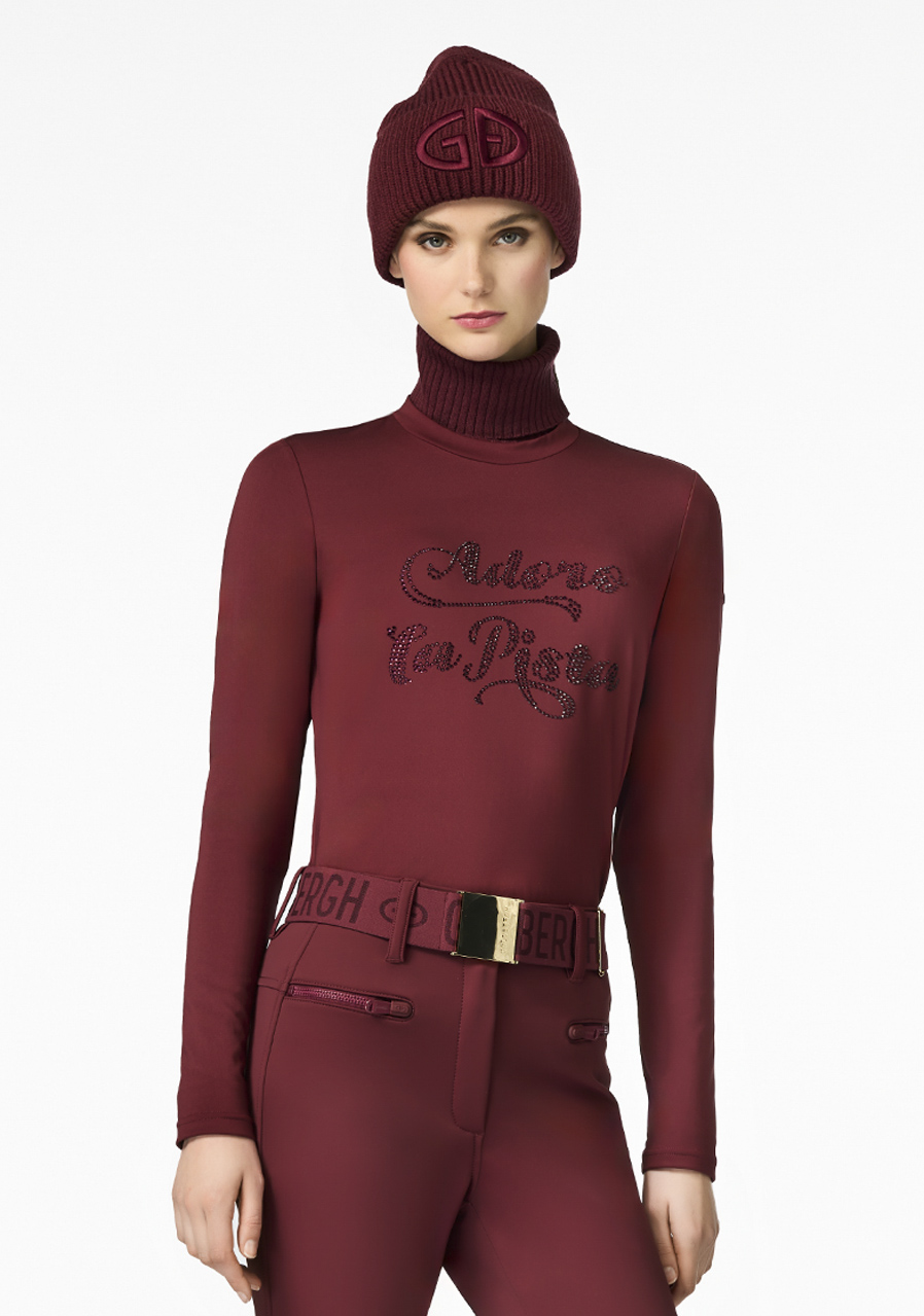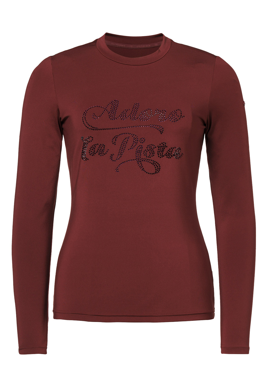 Toto priliehavé tričko je vyrobené z pružného powerstretch interlock materiálu, ktorý ponúka vysokú elasticitu, rýchle schnutie a efektívny odvod vlhkosti. Vďaka antibakteriálnej úprave zostáva svieže aj pri intenzívnych aktivitách. Na hrudi vyniká elegantná potlač „Adoro la pista“ zo strassových kamienkov, ktorá dodáva športovému modelu luxusný nádych. Tričko je doplnené kovovou značkovou etiketou na rukáve a tkanou etiketu na boku.
