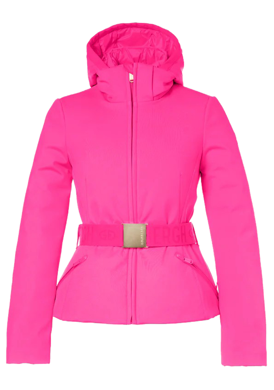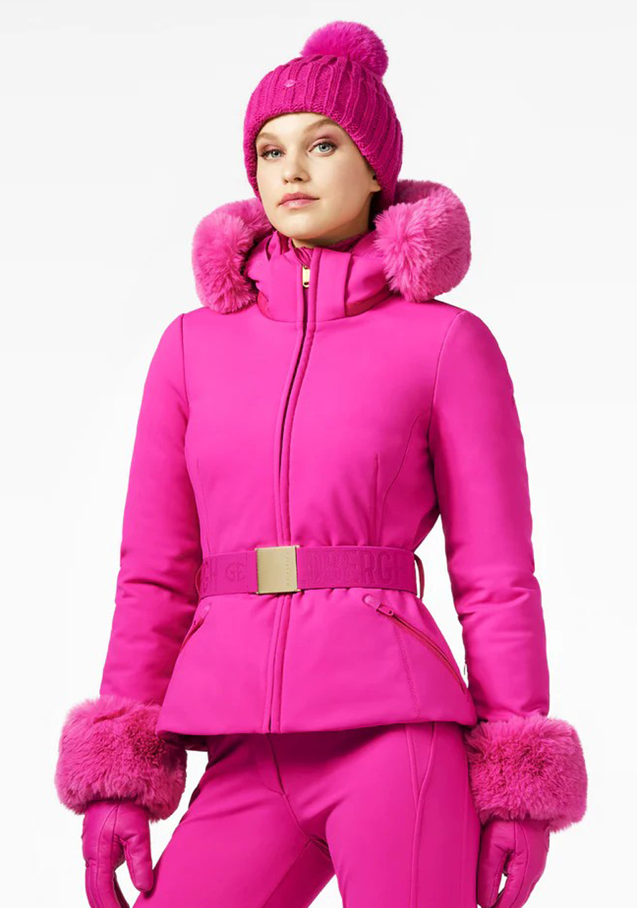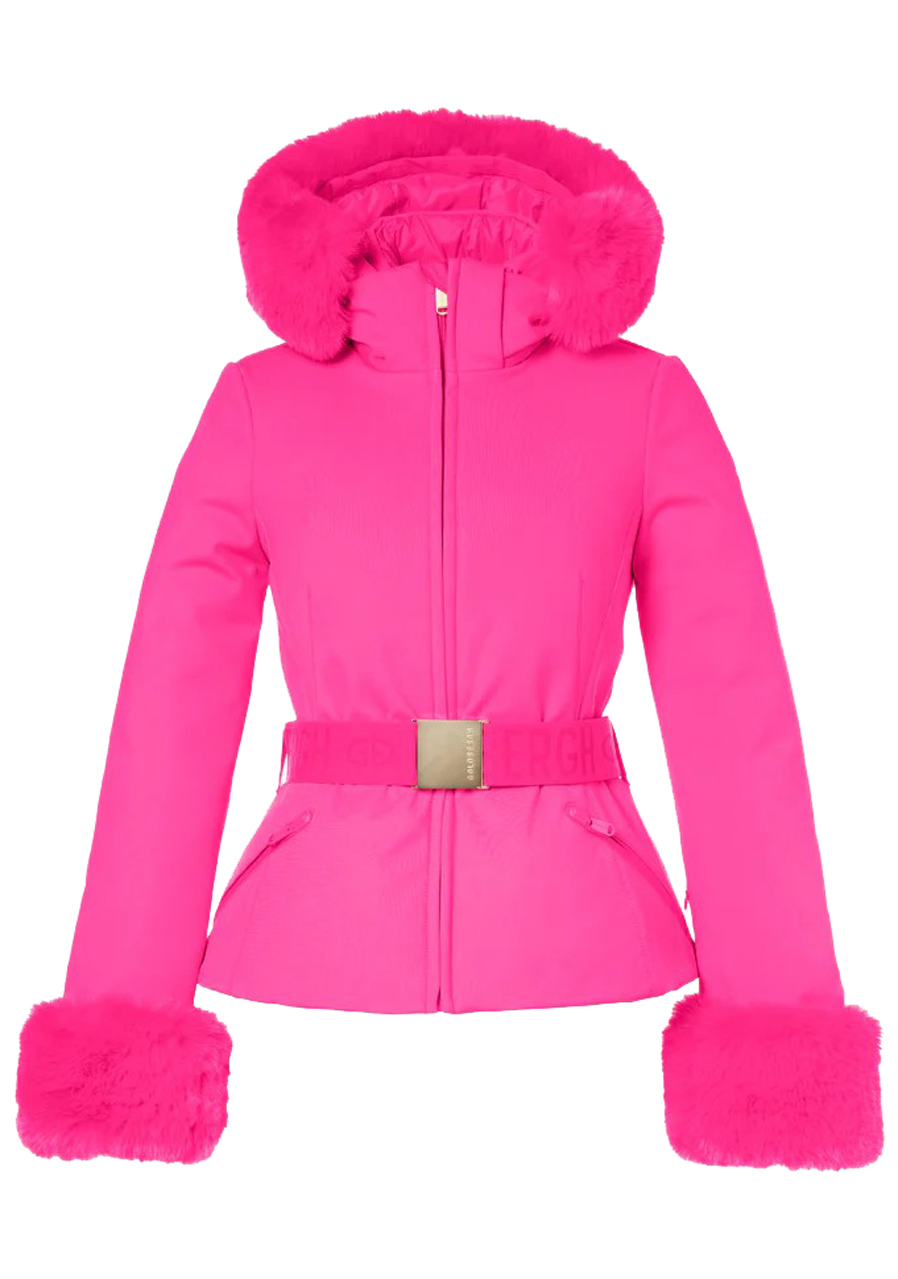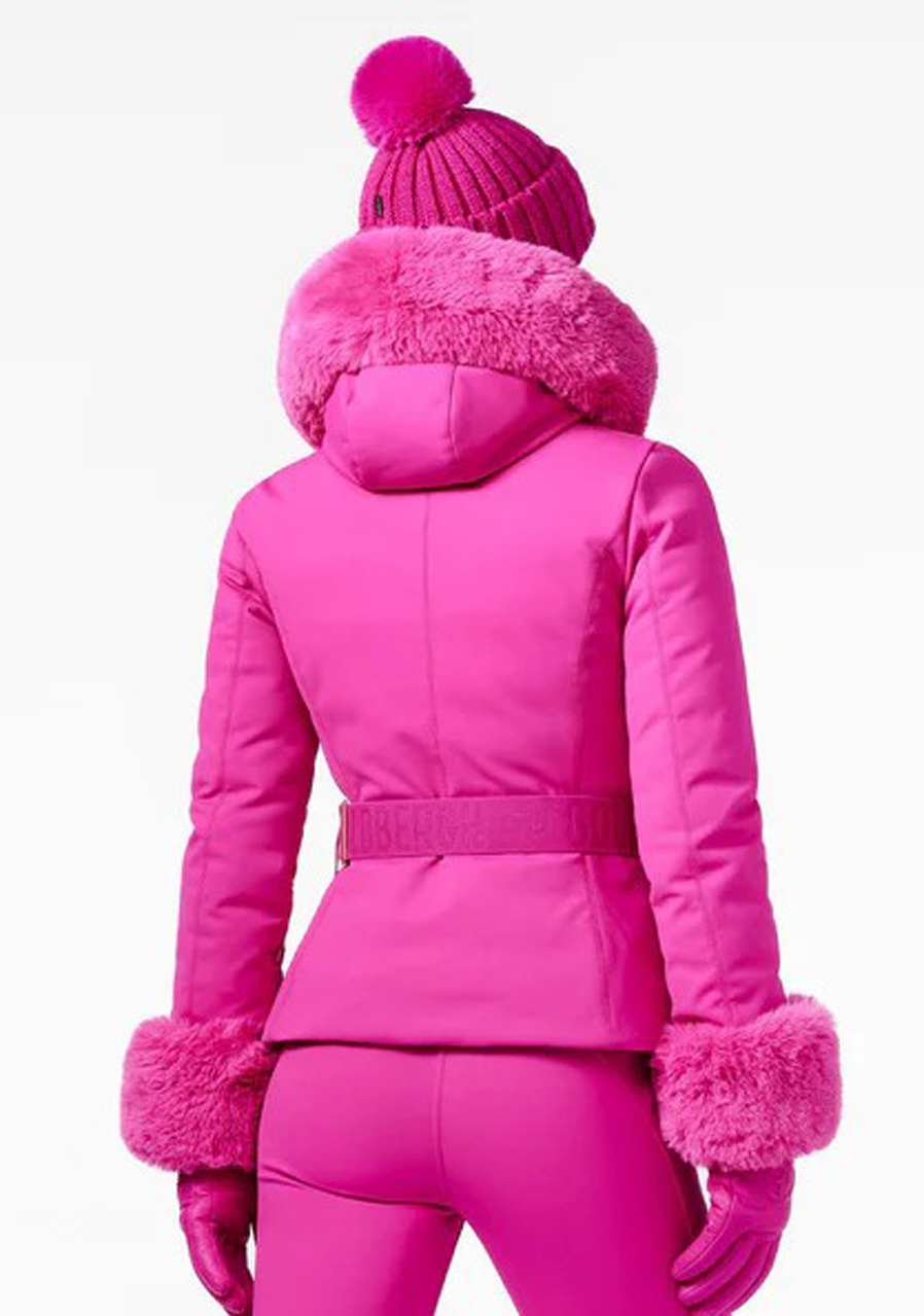 Goldbergh Giselle Faux Border Ski Jacket v ružovej farbe je štýlová dámska lyžiarska bunda so slim fit strihom navrhnutá pre maximálne pohodlie a funkčnosť na svahu. Je vyrobená z kvalitného softshellového materiálu s RDS certifikovaným kačacím perím a má odnímateľnú kapucňu s elastickým okrajom, ktorá poskytuje ochranu pred chladom. Štýlový opasok ozdobený prackou s logom Goldbergh dodáva modelu elegantný vzhľad. Praktické detaily zahŕňajú dve vonkajšie vrecká, dve vnútorné vrecká a vrecko na rukáve na skipas, vnútorné manžety s otvorom na palec a odnímateľný snehový pás. Štýlový vzhľad dopĺňa luxusná umelá kožušina na kapucni a rukávoch, ktorá dodáva bunde elegantný nádych.