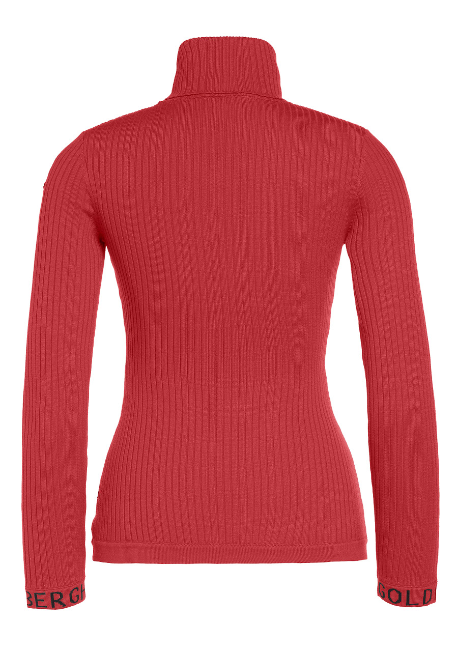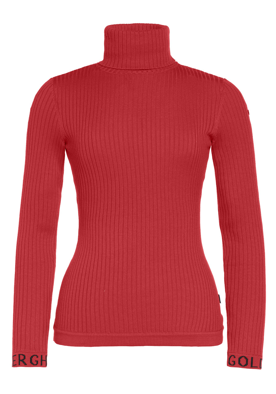 Tento slim fit rolák z jemného rebrovaného úpletu ponúka priliehavý strih, ktorý krásne zvýrazní postavu. Rolák s preloženým golierom poskytuje pohodlné teplo, zatiaľ čo kontrastný nápis Goldbergh na manžetách pridáva športový a moderný detail. Kovové a tkané značkové etikety na rukáve a boku sveter decentne zdobia a podčiarkujú jeho prémiovú kvalitu.