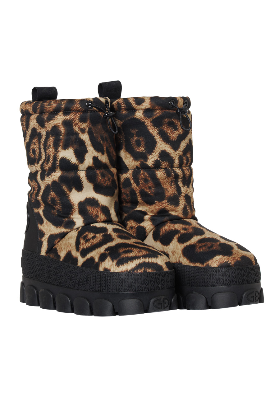 Tieto členkové snehové topánky spájajú odvážny dizajn s praktickou zimnou výbavou. Zvršok zo softshellu zdobí výrazná celoplošná leopardia potlač, doplnená robustnou podrážkou pre moderný a odolný vzhľad. Vodeodolná vnútorná konštrukcia udrží nohy v suchu, zatiaľ čo elastická šnúrka s logom a nastaviteľnou brzdičkou zabezpečí pohodlné a pevné stiahnutie v hornej časti. 3D logo GB na päte a elastické pútko na zadnej časti uľahčujú obúvanie.