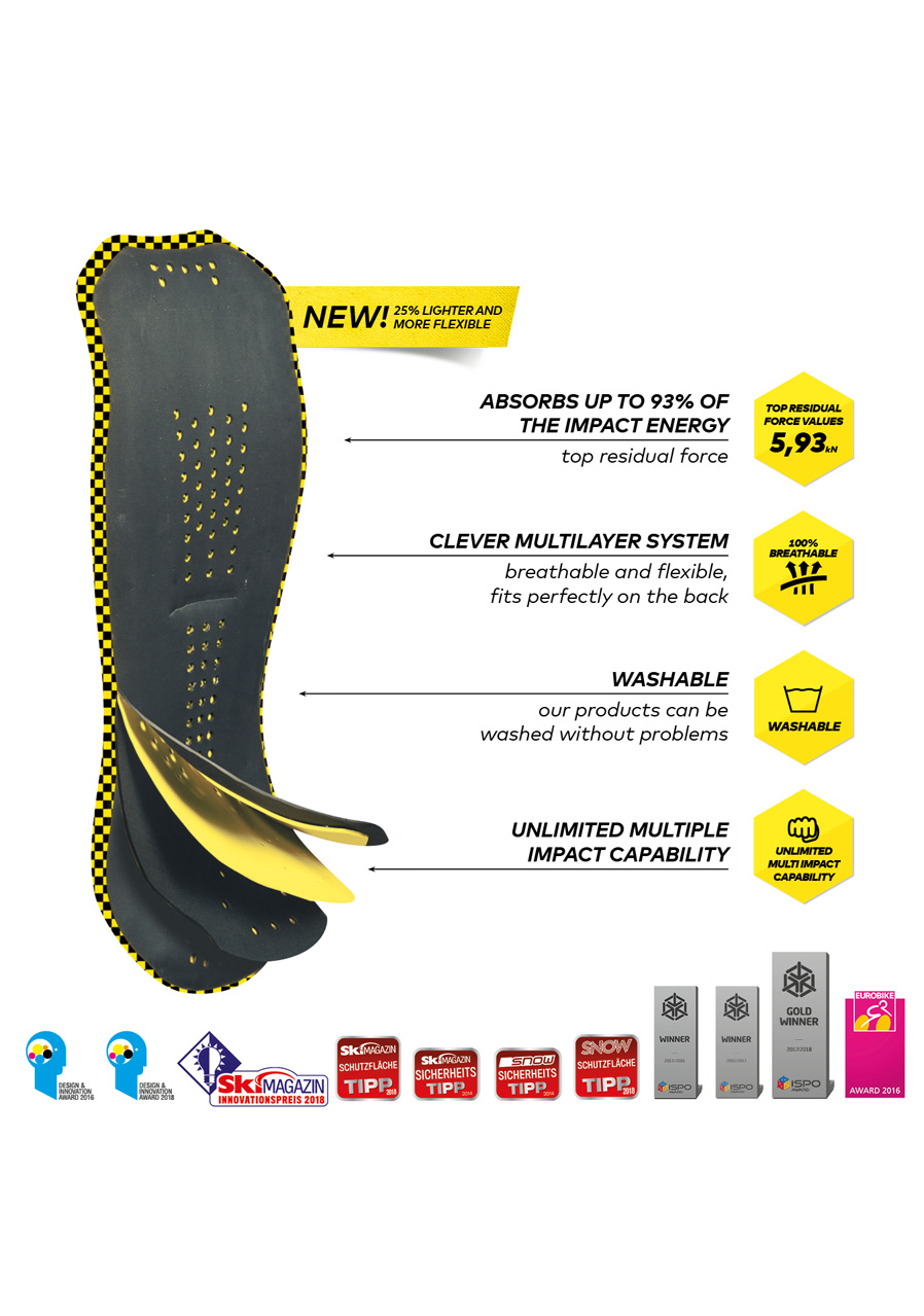 Chránič je certifikovaný podľa normy EN 1621-2 úroveň 1, čo garantuje efektívnu ochranu chrbtice pred nárazmi a otrasmi. Materiál absorbuje energiu pri náraze a zároveň zostáva komfortný aj pri dlhšom použití. Tvar a spracovanie sú optimalizované pre ženskú postavu.