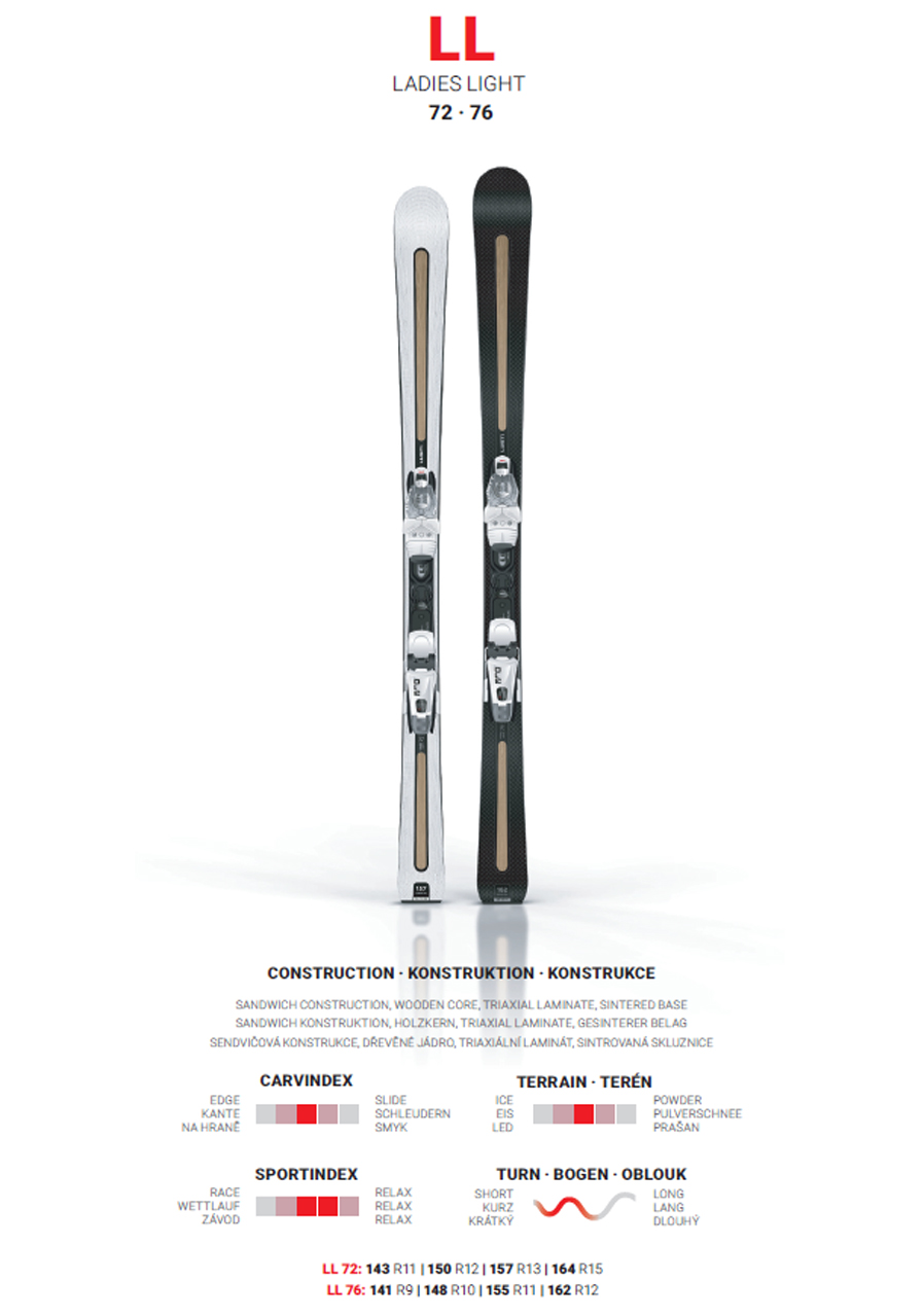Kvalitná a vyvážená dámska lyže, určená prevažne na zjazdovky je vhodná najmä pre stredné a dlhšie oblúky v stredných rýchlostiach. Vďaka celodrevenému jadru z ľahkého dreva paulownia a klasické vrstvené konštrukcii je lyža ľahší a ochotnejší k priehybu v oblúku takže vyhovie aj ľahším lyžiarkam, zároveň si zachováva dostatočnú stabilitu aj pre jazdu na tvrdom povrchu. LL 72 je ideálnou voľbou pre široké spektrum lyžiarok od začiatočníci, po nadpriemerné rekreačné jezdkyně.Má rada carvingový oblúk, nevadí jej ale ani šmýkaniu. Lyže nie je príliš vhodná pre jazdu mimo upravené trate. Športovejší alternatívou dámske lyže je LP 72.