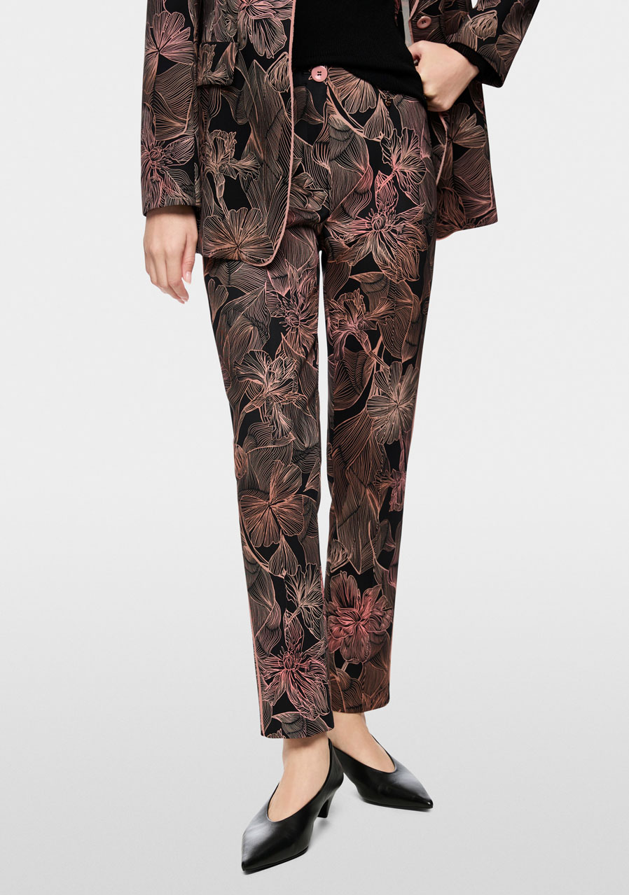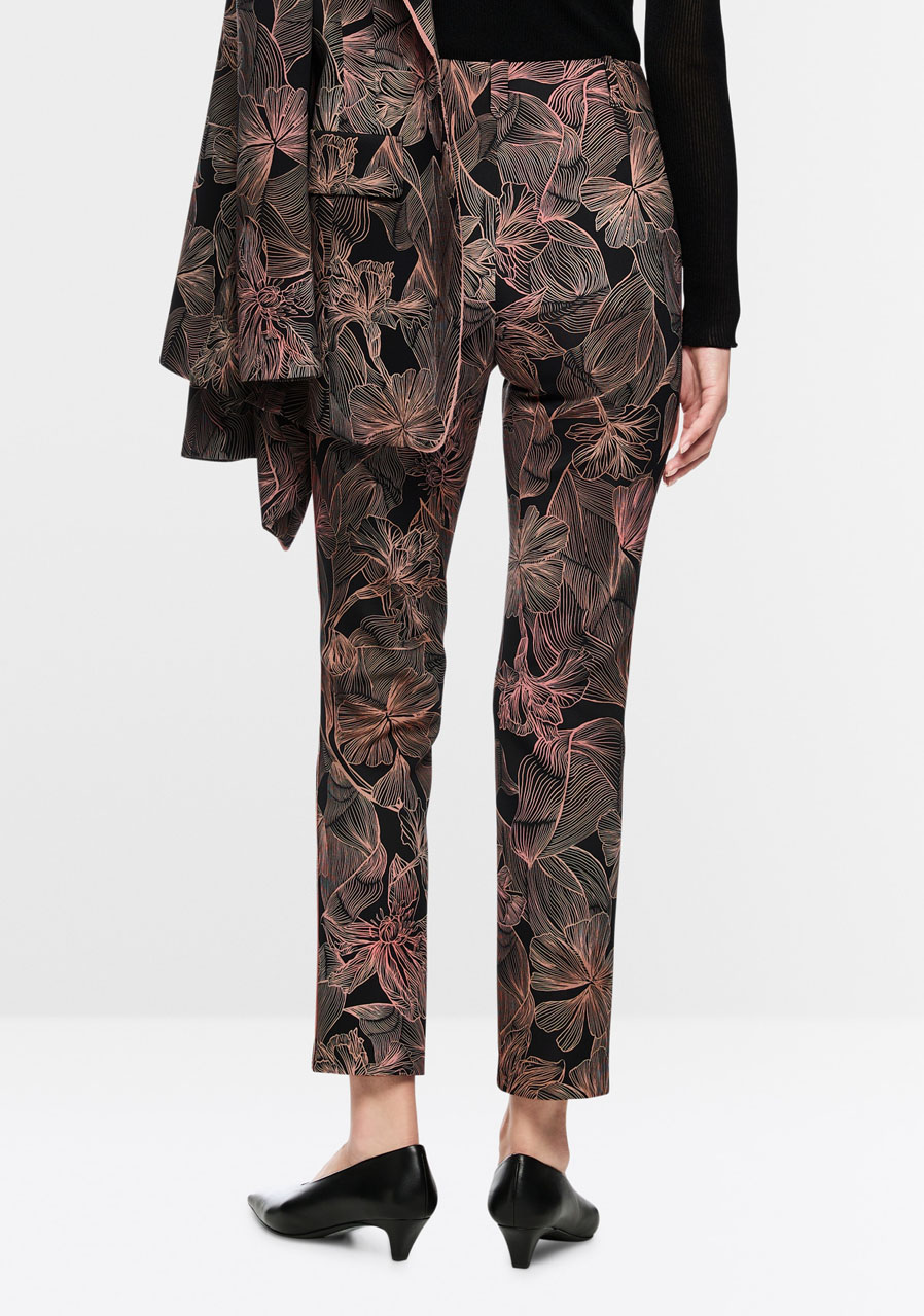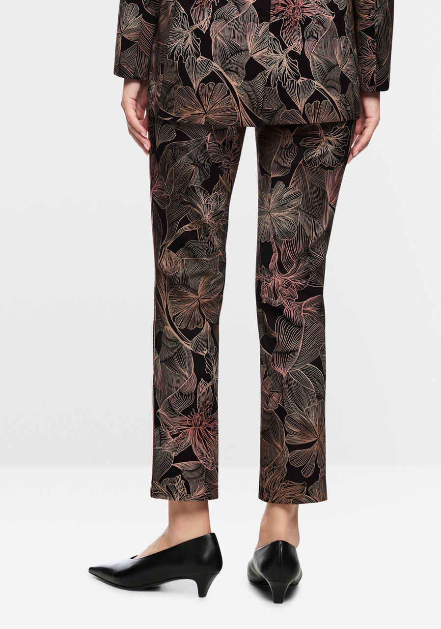 Nohavice SYDNEY predstavujú moderný, úzko strihaný model so skrátenými priliehavými nohavicami a elegantným záhybom, ktorý dodáva celému looku upravený charakter. Sú vyrobené z pohodlného potápačského džerseja, čo zaisťuje mimoriadny komfort počas nosenia a príjemnú pružnosť. Celoplošná kvetinová potlač prepožičiava nohaviciam výrazne ženský štýl, ktorý je možné perfektne zladiť so sakom v rovnakom dizajne pre sofistikovaný set. Ozdobný bočný prúžok dodáva moderný športovo-elegantný akcent.