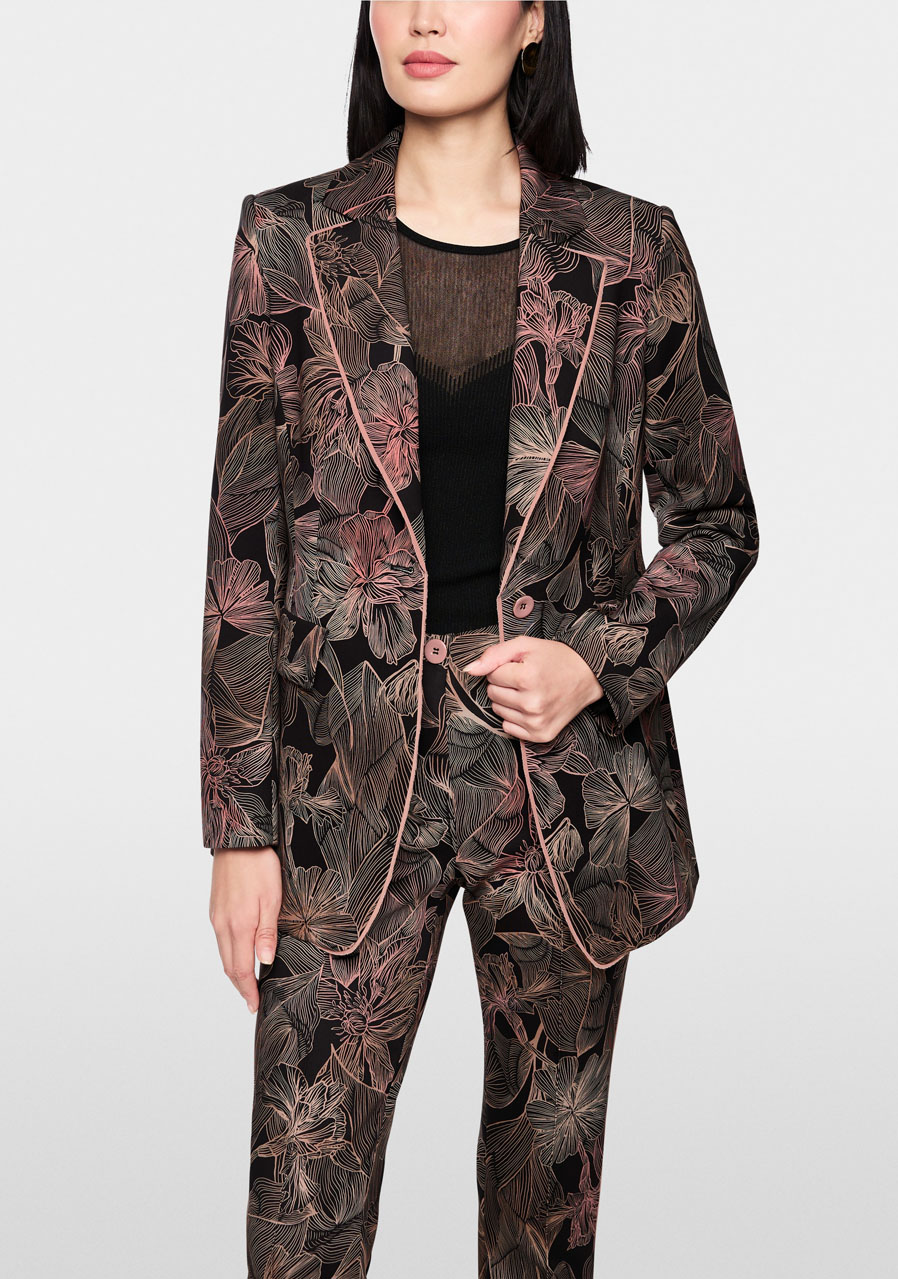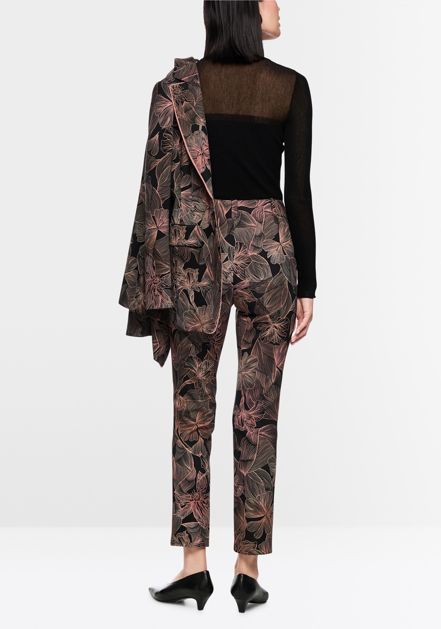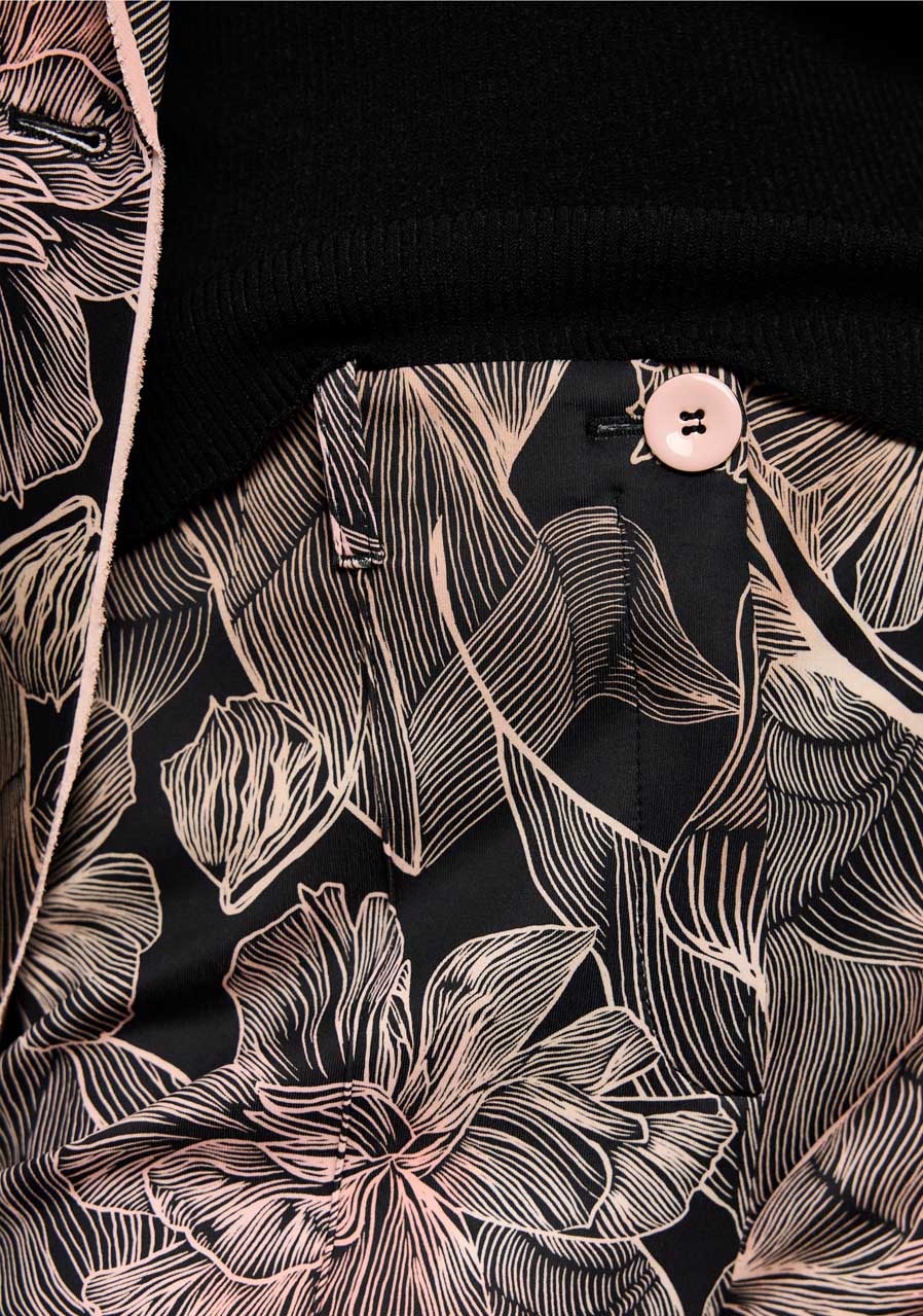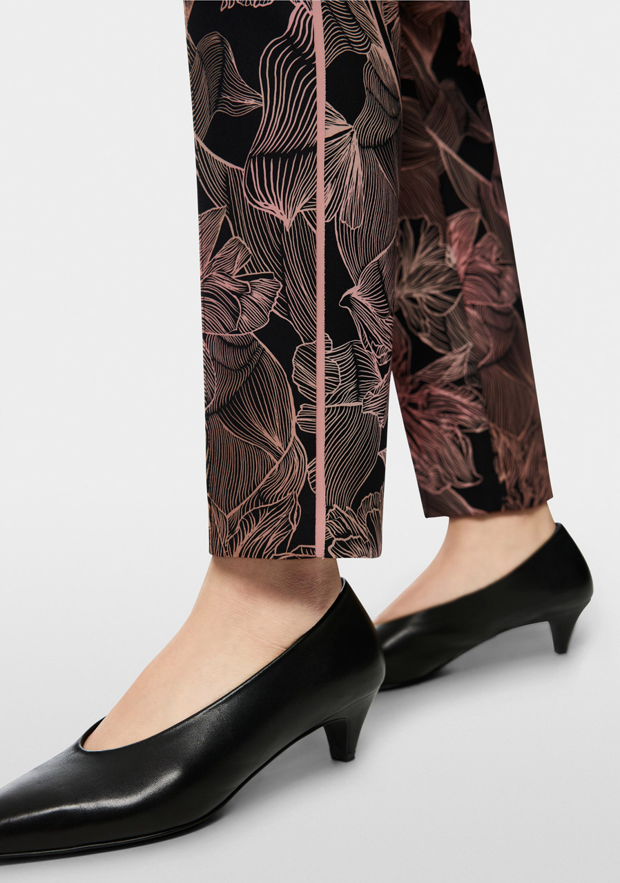 Nohavice SYDNEY predstavujú moderný, úzko strihaný model so skrátenými priliehavými nohavicami a elegantným záhybom, ktorý dodáva celému looku upravený charakter. Sú vyrobené z pohodlného potápačského džerseja, čo zaisťuje mimoriadny komfort počas nosenia a príjemnú pružnosť. Celoplošná kvetinová potlač prepožičiava nohaviciam výrazne ženský štýl, ktorý je možné perfektne zladiť so sakom v rovnakom dizajne pre sofistikovaný set. Ozdobný bočný prúžok dodáva moderný športovo-elegantný akcent.