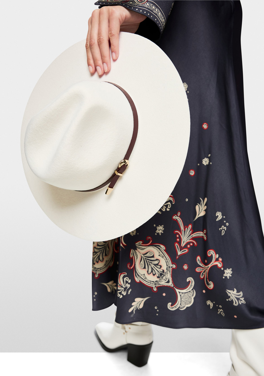 Parametre: Materiál 100% vlna Opasok 100% koža Aplikácia 100% kov Okraj široký Tvar pozdĺžna brázda na korunke Bočné preliačiny klasický fedora tvar Detaily kožený remienok s kovovou aplikáciou Štýl elegantný, nadčasový