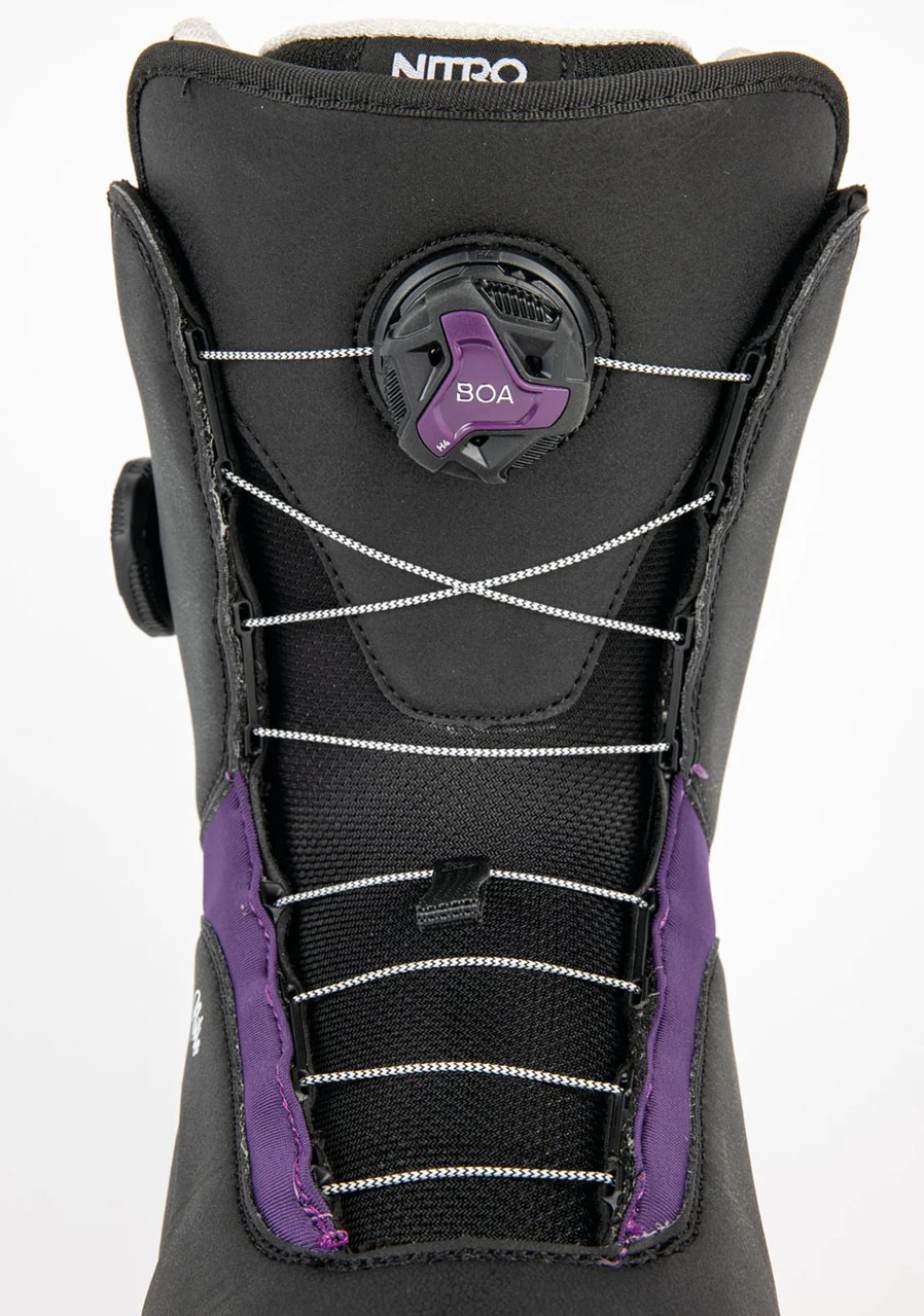 Nitro SCALA BOA Black-Purple jsou snowboardové boty navržené speciálně pro ženy, které hledají kombinaci pohodlí, výkonu a stylu. Díky systému BOA® Fit System nabízí boty rychlé a precizní utažení, které vám umožní nastavit boty podle vašich individuálních potřeb. Tyto boty jsou ideální pro začátečníky a středně pokročilé snowboardistky, které si chtějí užívat jízdu na sjezdovce a v prašanu.
