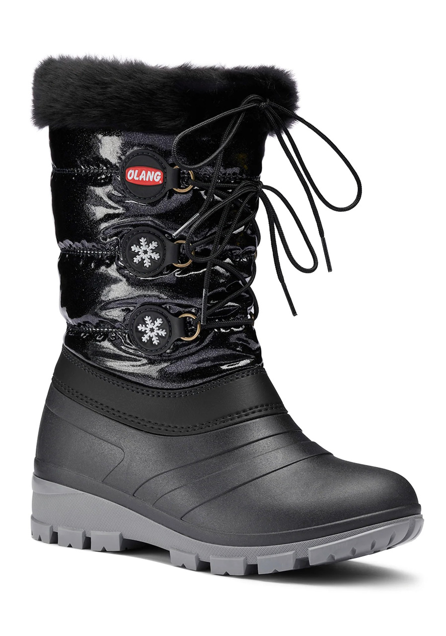 Olang Patty Ice I81 Nero Ice je dámska zimná obuv s elegantným dizajnom a výrazným kožušinovým golierom, vhodná do mestského prostredia. Zvršok z lesklého syntetického materiálu a textilu je vybavený vodoodolnou membránou Olantex, ktorá účinne chráni pred snehom a vlhkosťou. Vnútro vrátane lemu je zateplené umelým kožúškom, ktorý poskytuje príjemné teplo. Protišmyková podrážka so systémom OC System® zabezpečuje stabilitu aj na zľadovatených chodníkoch. Určenie: dámska zimná obuv do mesta Zvršok: lesklá syntetika a textil s membránou Olantex Zateplenie: umelý kožúšok vrátane vrchného lemu Podrážka: OC System® – výklopné hroty proti pošmyknutiu Zapínanie: šnurovanie Farba: čierna so sivým lemom (Nero Ice – I81)
