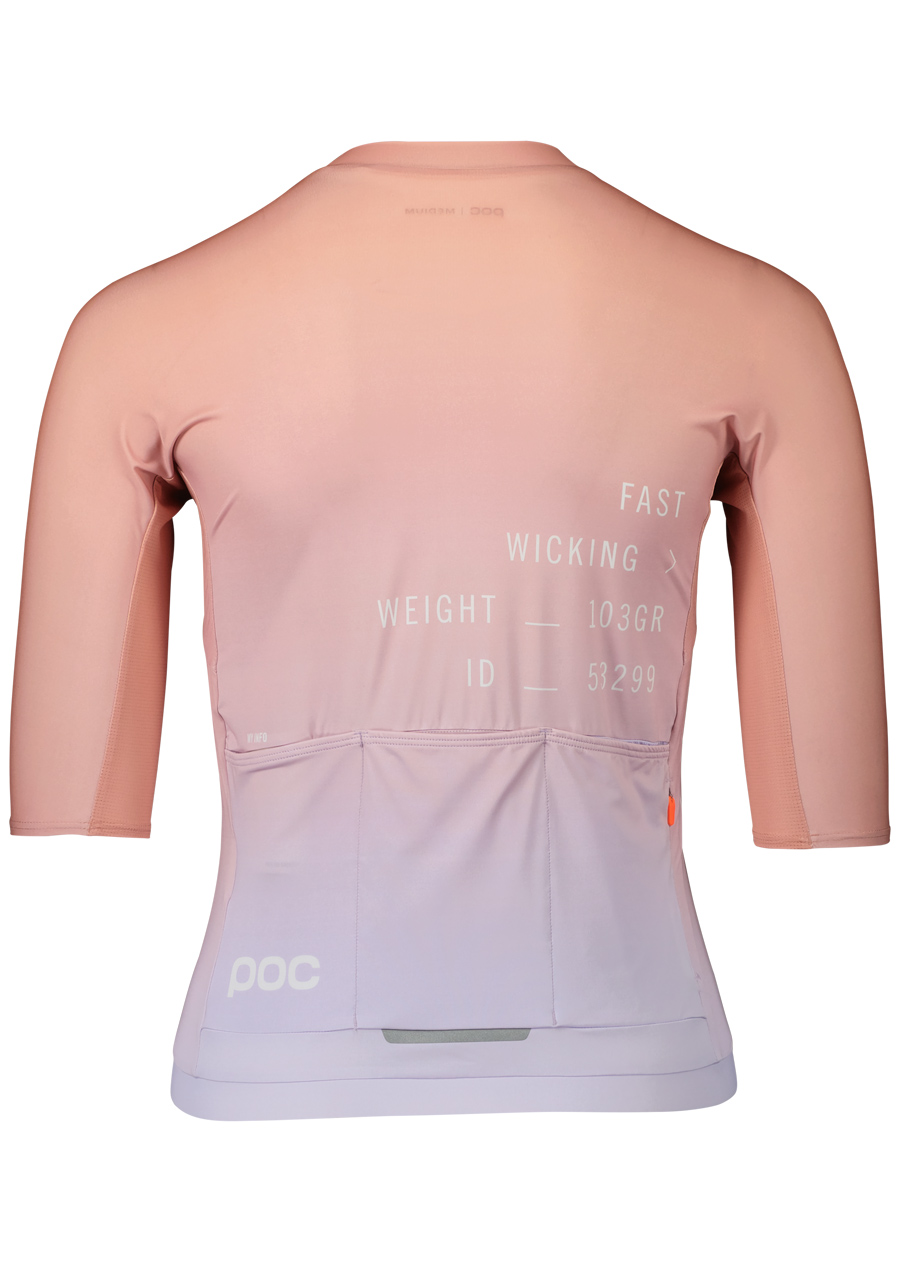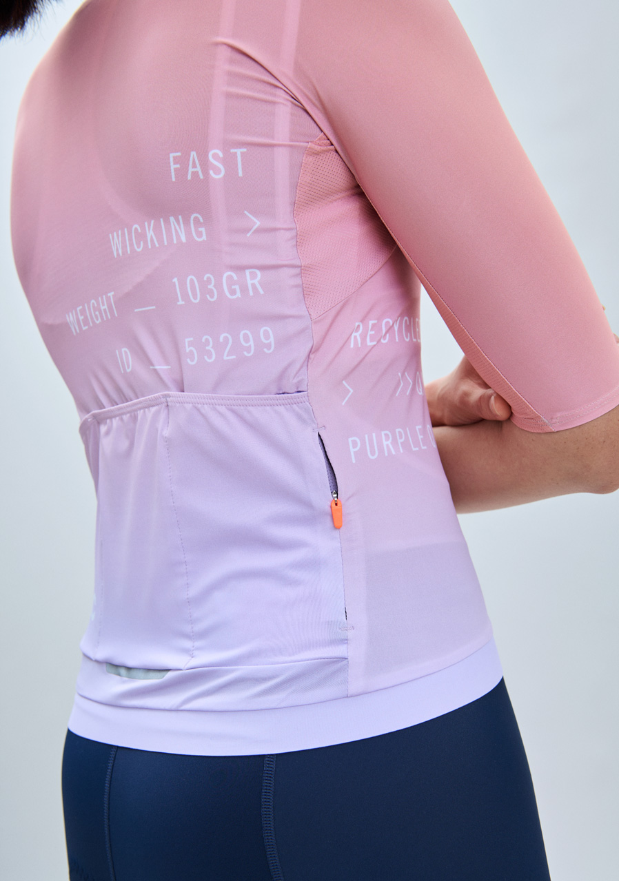 Elegantný a technický dres vhodný na výkonnostnú aj rekreačnú jazdu v teplom počasí Materiál: 100 % recyklovaný materiál Strih: rovný, nízky golier, minimum švov, predĺžené rukávy Vlastnosti: vysoká priedušnosť, rýchly odvod vlhkosti, zips po celej dĺžke, reflexné prvky Ventilácia: sieťované panely na bokoch a pod vreckami Vrecká: 3 zadné vrecká, 1 malá vrecko na zips Bezpečnosť: štítok na zadanie zdravotných a kontaktných údajov, reflexné prvky Stabilita: silikónový pás na vnútornej strane spodného lemu Farba: Gradient Purple Quartz