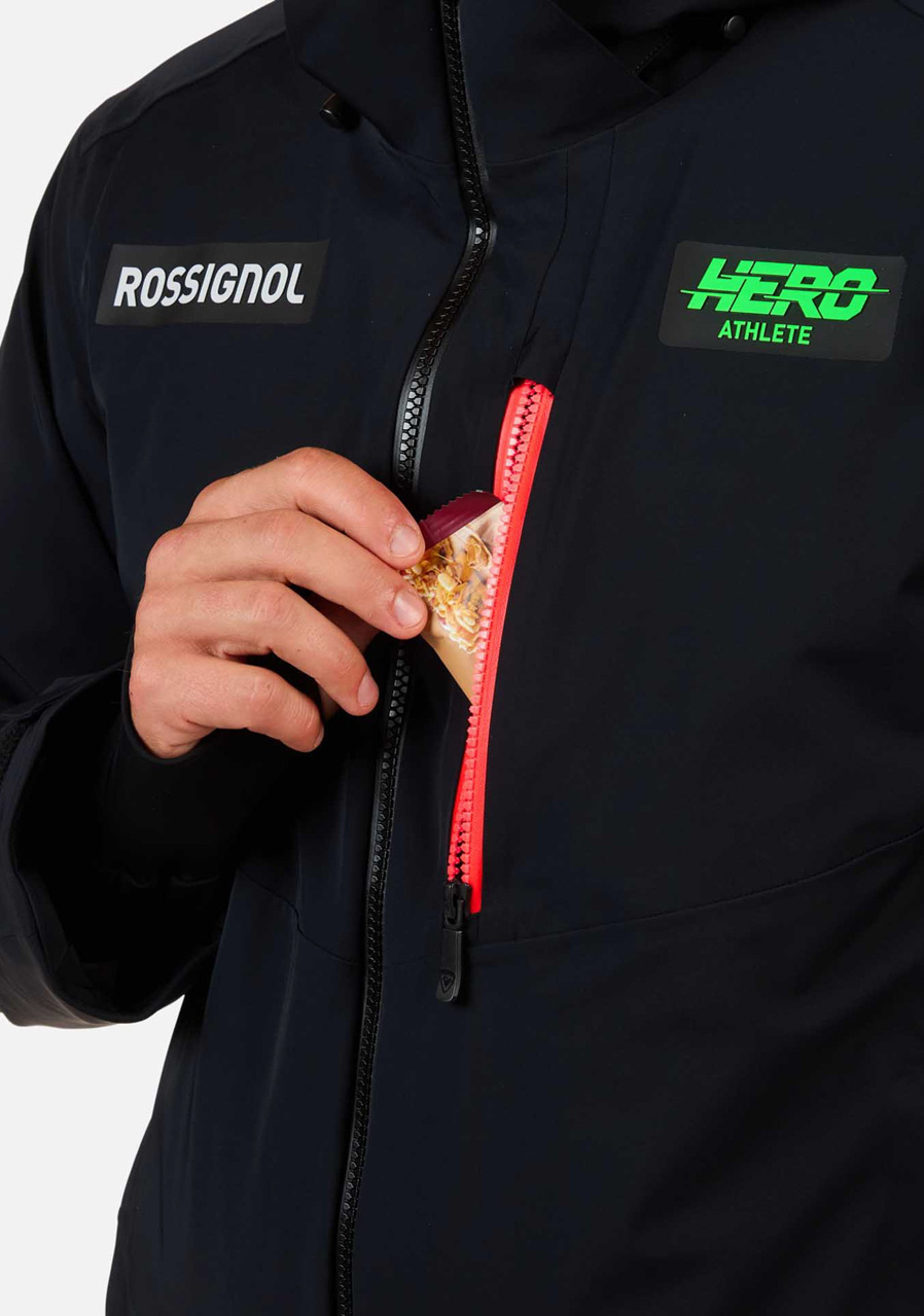 Vysoko výkonná pánska bunda Rossignol Hero Blackside v čiernej farbe kombinuje štvorsmerne strečový materiál s vodeodolnou a priedušnou technológiou, aby vás udržala v suchu a pohodlí aj v najnáročnejších horských podmienkach. Nízkoprofilová izolácia Primaloft® Black poskytuje teplo bez objemu a je vyrobená z recyklovaných materiálov, čím podporuje udržateľnosť. Technológia HeiQ Smart Temp automaticky reguluje teplo podľa telesnej teploty a odnímateľná kapucňa umožňuje individuálne nastavenie. Praktické detaily, ako sú integrovaný snehový pás, manžety s pútkami na palec, vetracie zipsy a pútko na okuliare, dopĺňajú funkčnosť bundy pre all-mountain lyžovanie.