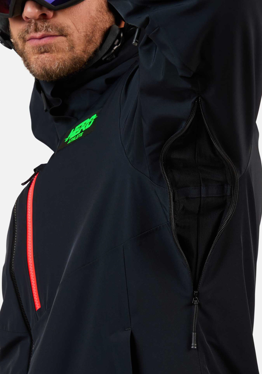 Funkcia lyžiara : integrovaný snehový pás, manžety s pútkami na palec, vetracie zipsy, pútko na okuliare