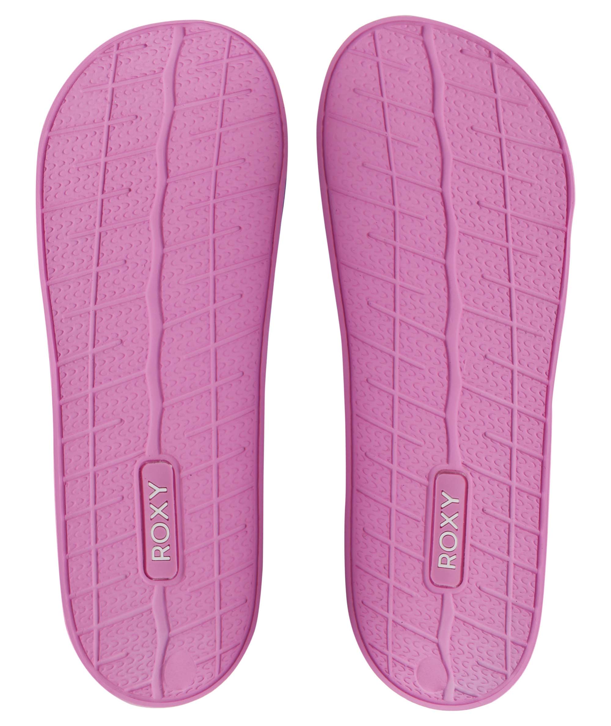 Pohodlné detské voľnočasové šľapky Roxy v ružovej farbe. Ľahko tvarovaná mäkká stielka nespôsobuje otlačeniny ani pľuzgiere. Gumová podrážka zaručuje pohodlnú chôdzu. Cez priehlavok široký pás a nápisom Roxy, čo je typické pre túto značku. Vhodné ako do mesta tak k vode, kedy papuče vydržia aj náročné detské zaobchádzanie