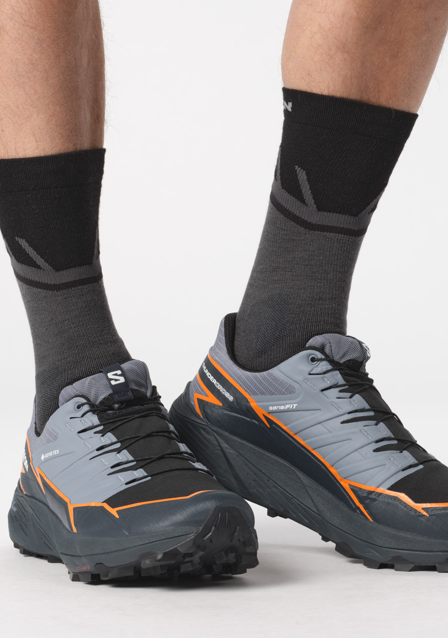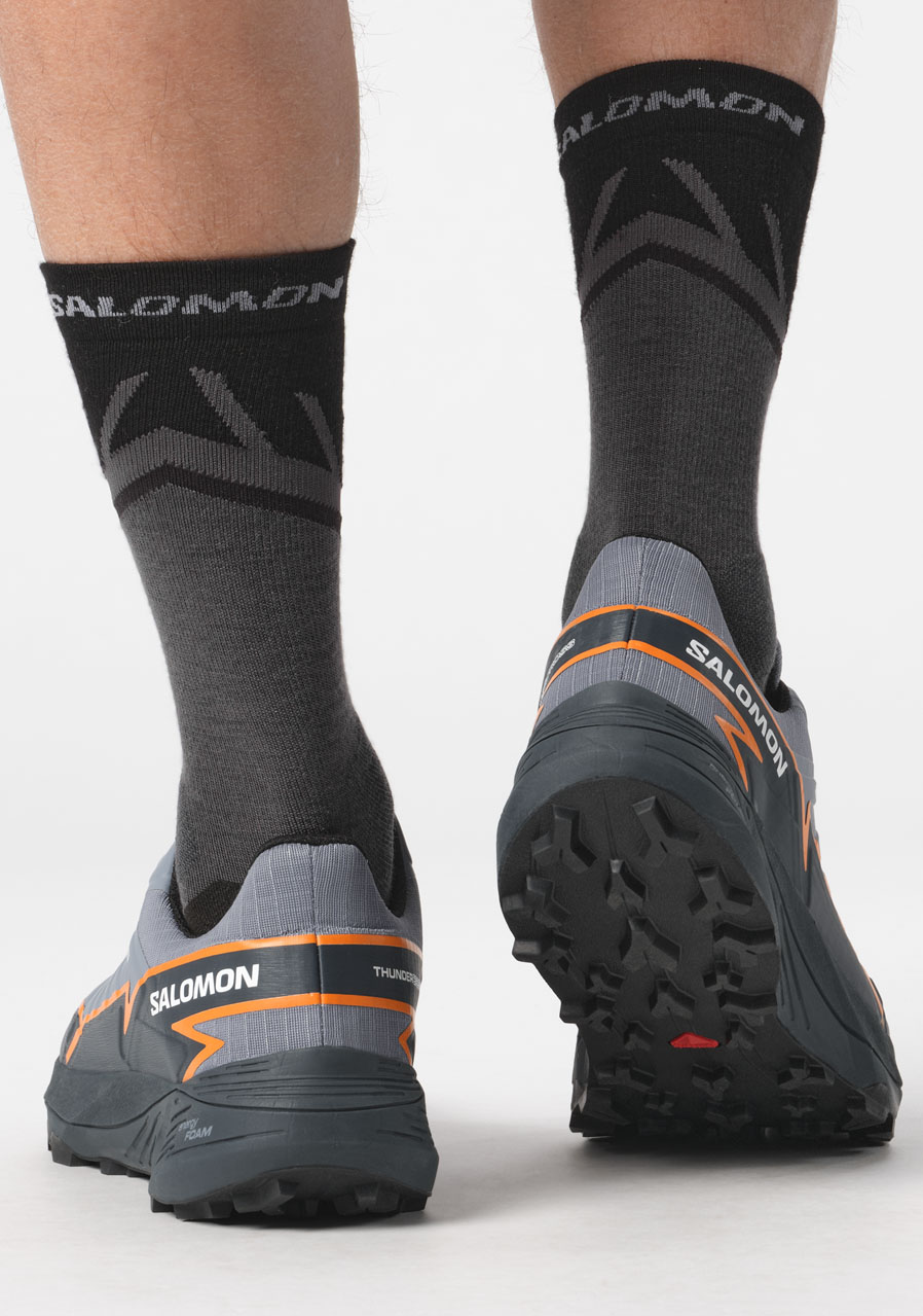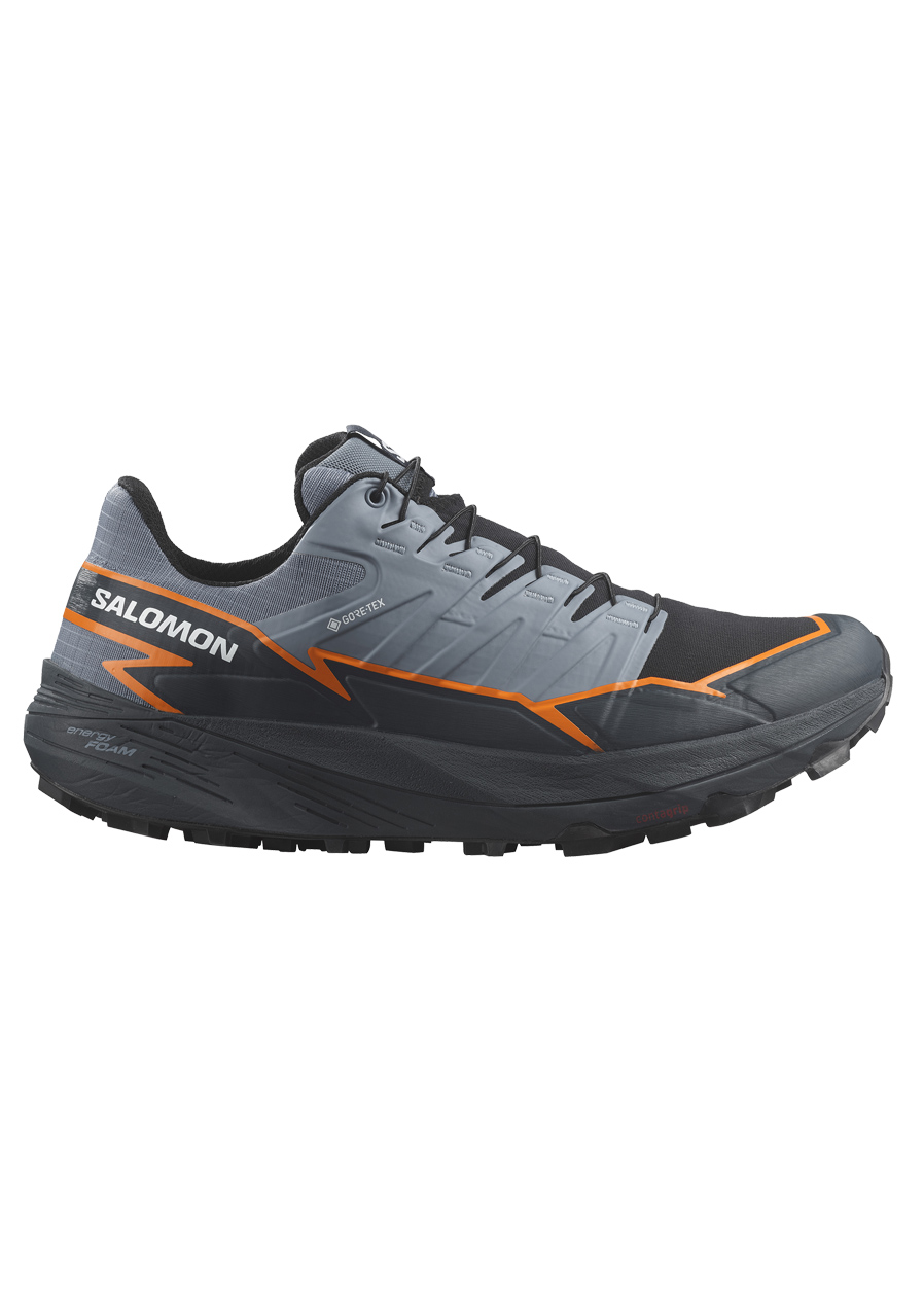 Salomon THUNDERCROSS GTX spája svižnosť bežeckej DNA s robustnou ochranou a trakčnou podrážkou vhodnou do každého terénu. Membrána GORE-TEX® zabezpečí, že nohy zostanú suché aj počas brodenia mokrými úsekmi, zatiaľ čo agresívny vzor Contagrip® MA poskytuje maximálny záber v blate, na mokrých kameňoch aj štrkových cestách. Technológia Profeel Film™ chráni chodidlo pred ostrými kamienkami a koreňmi a ľahká medzipodošev EnergyCell™ tlmí nárazy bez straty dynamiky.