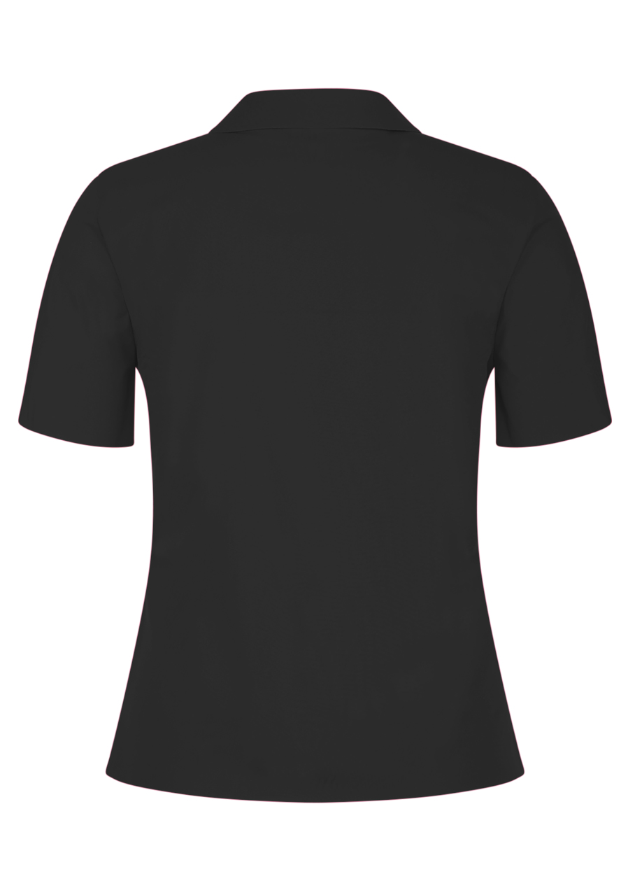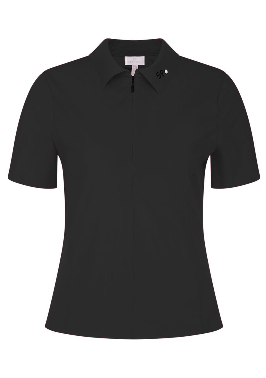 Další parametry: Mírně přiléhavý střih, sportovně módní styl, košilový límeček, otevřený okraj, krátké rukávy s žebrovaným lemem a gumou uvnitř, technický žerzej. Otevřený lem, krátké boční rozparky, malý skrytý zip uprostřed přední části, malý transferový potisk na límečku.