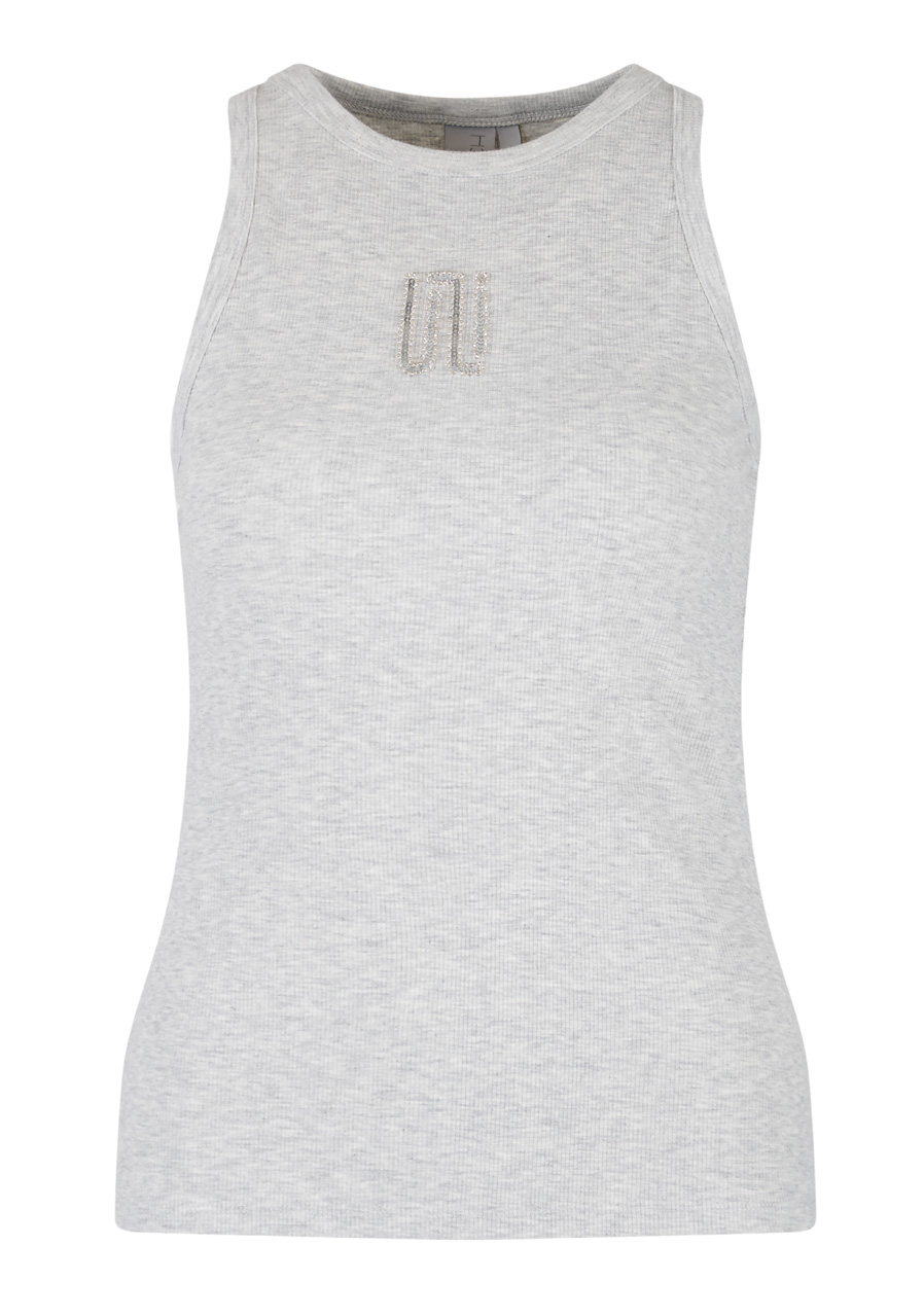 Tento výrazný Glam top s americkým tank crew výstrihom okamžite priťahuje pozornosť svojim rafinovaným strihom a luxusným detailom na prednej strane. Zvýraznené prieramky a priliehavý slim fit strih podčiarkujú ženskú siluetu, zatiaľ čo mäkký rebrovaný jersey zaisťuje maximálne pohodlie. Hlavným prvkom je trblietavá výšivka loga z perál a flitrov, ktorá dodáva modelu exkluzívny a športovo-elegantný nádych. Perfektný pre štýlové kombinácie - od ležérnych outfitov až po večerné looky.