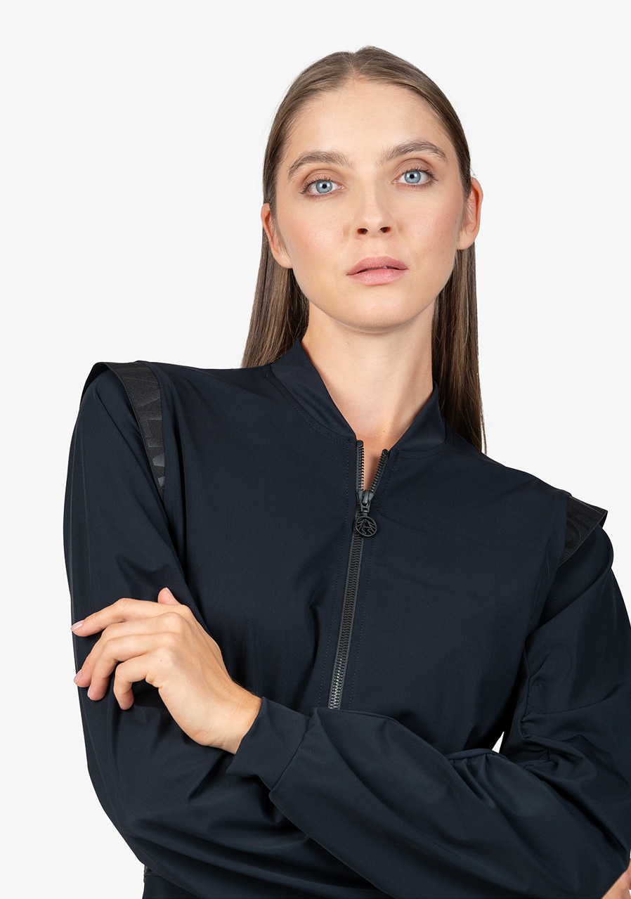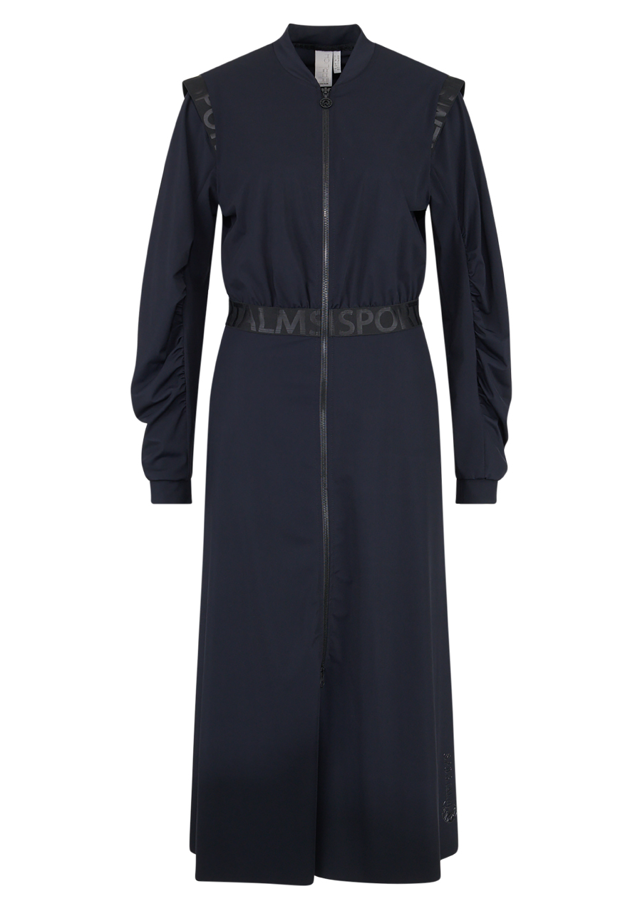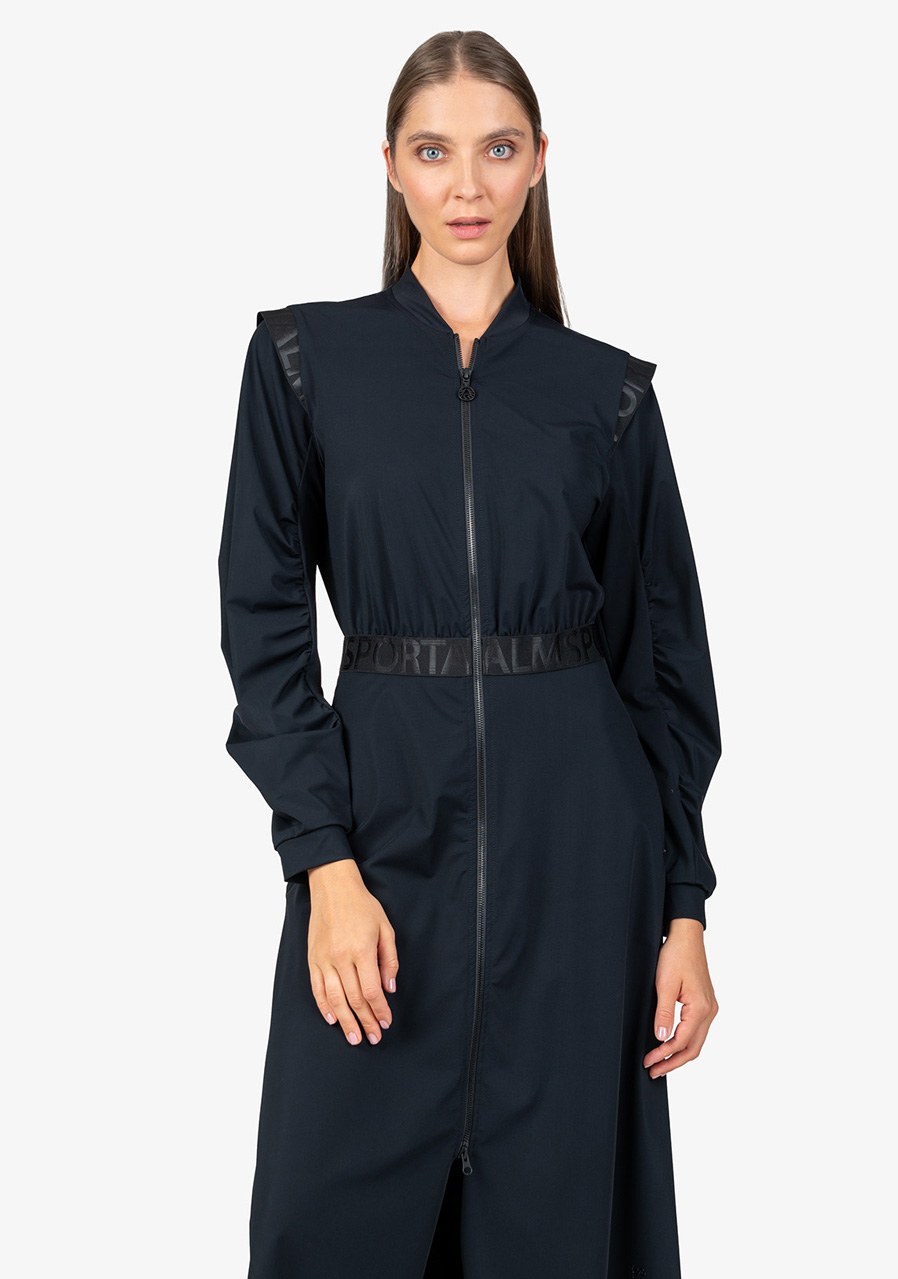 Další parametry: Detailní prvky jako vysokoškolský límec, objemné nabírané rukávy a blousonový top s elastickým pasem dodávají kabátu stylový charakter. Rozparek vpředu, efektní neopracované okraje a potisk nápisu na lemu sukně přidávají na originalitě.