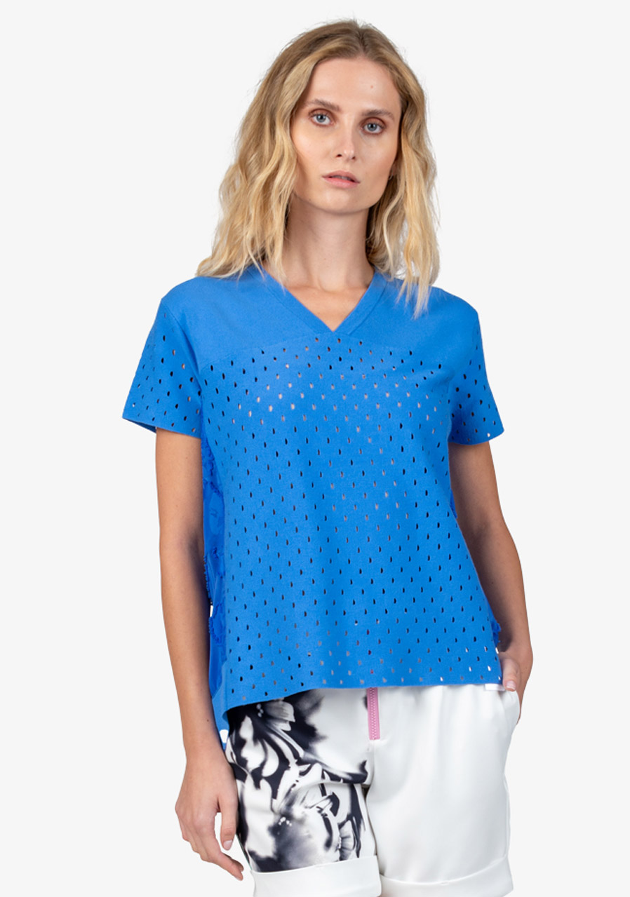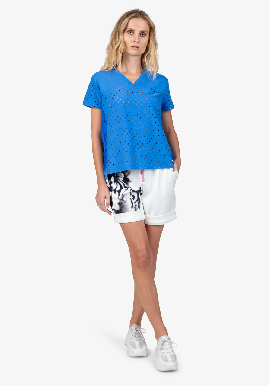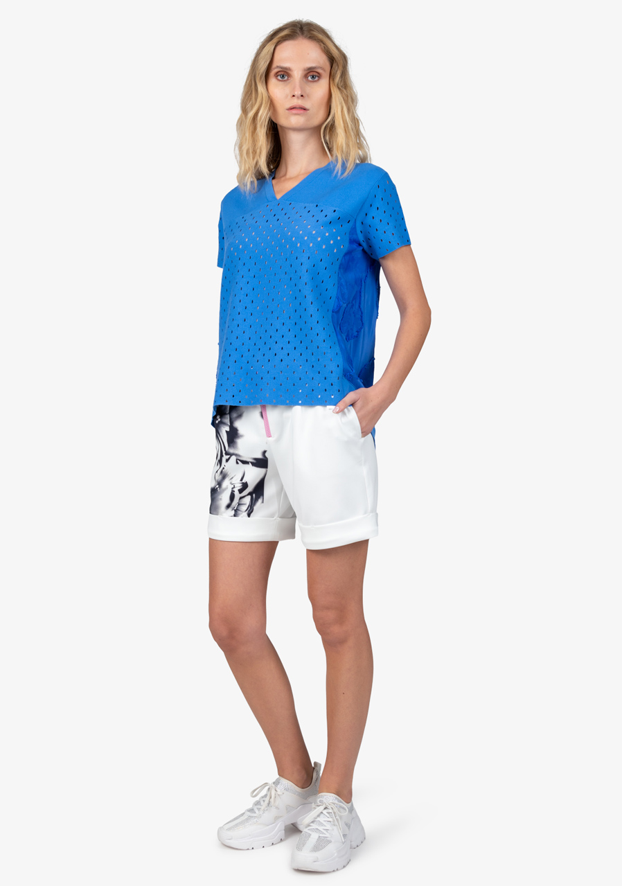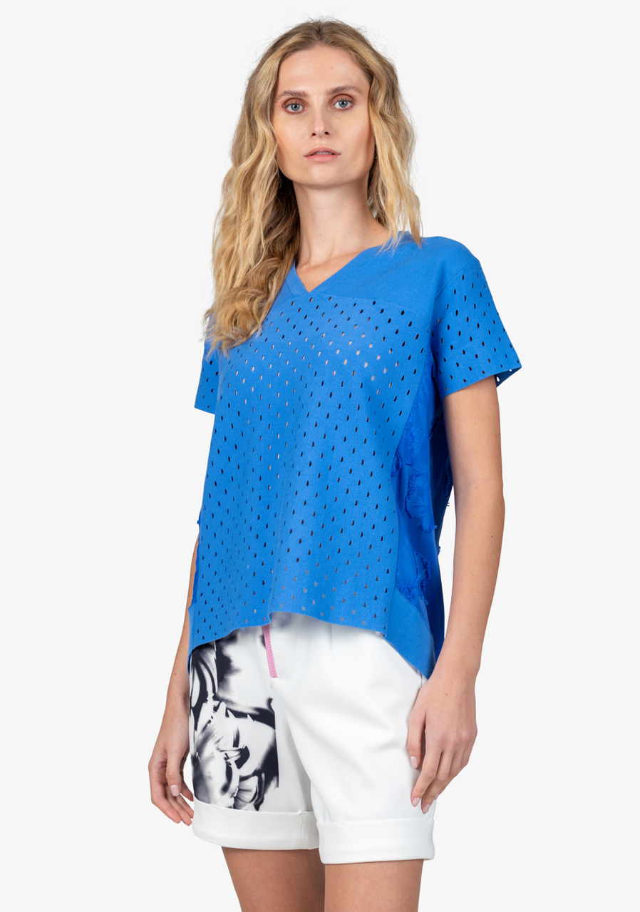 Dámský svetr Sportalm 450170 v barvě Amparo Blue je elegantním kouskem, který spojuje lehkost a sofistikovanost, ideální pro teplé dny. Tento svetr s polovičním rukávem je kombinací letní pleteniny a kvalitní polyesterové příze s květinovým potiskem, díky čemuž vyniká nejen komfortem, ale i unikátním designem.