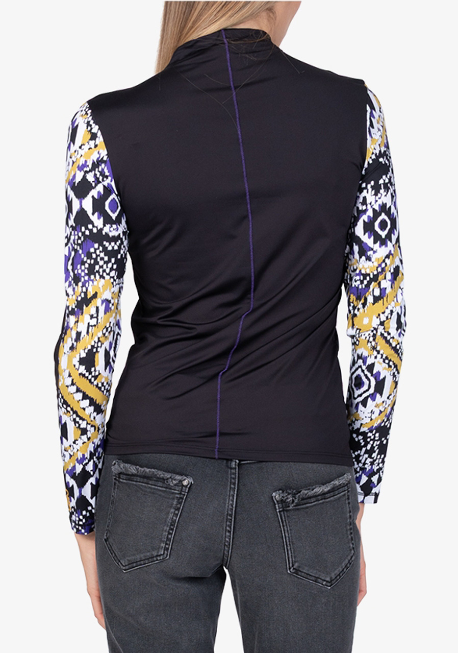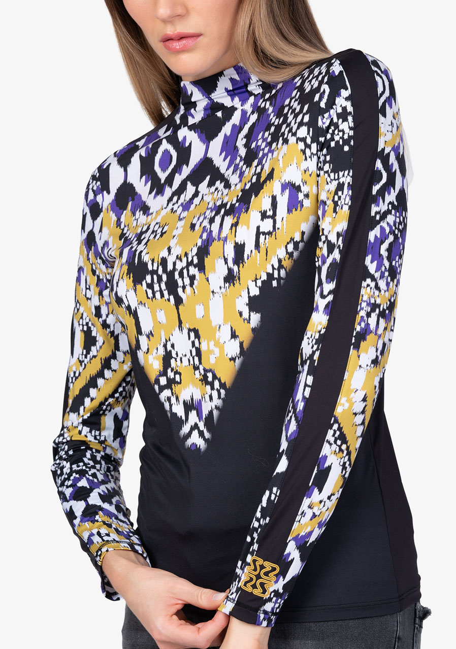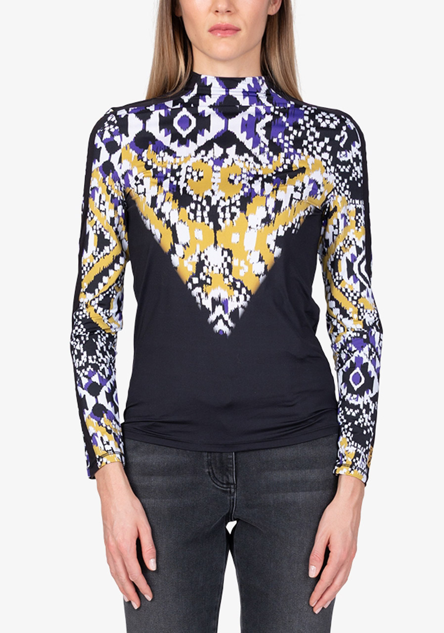 Parametre: Materiál : 85% polyester, 15% elastan Strih : priliehavý, elastický Golier : rolákový, jemne priliehajúci Rukávy : dlhé Dizajn : čierny základ s originálnou potlačou Sezóna : jeseň / zima, vhodné ako samostatný kúsok aj pod sako či sveter