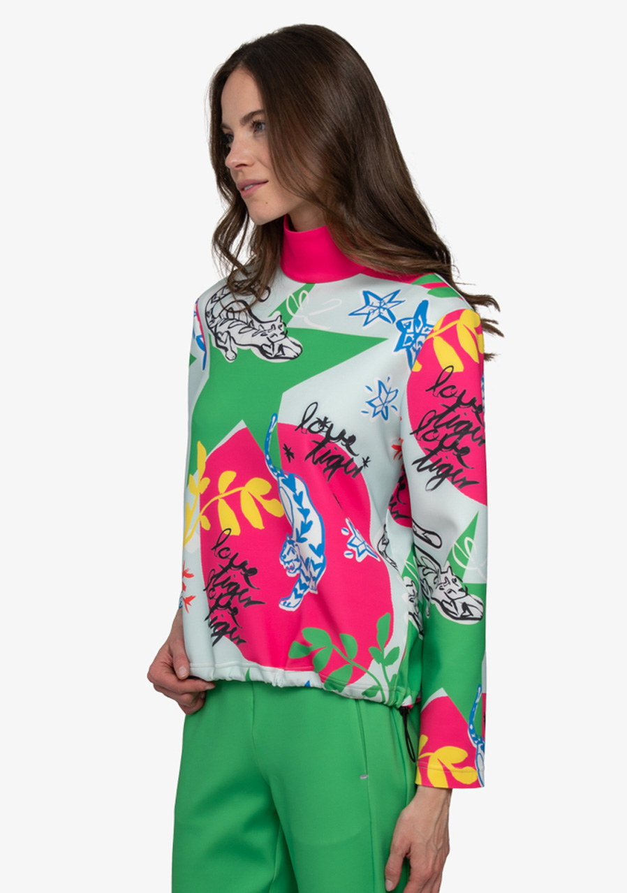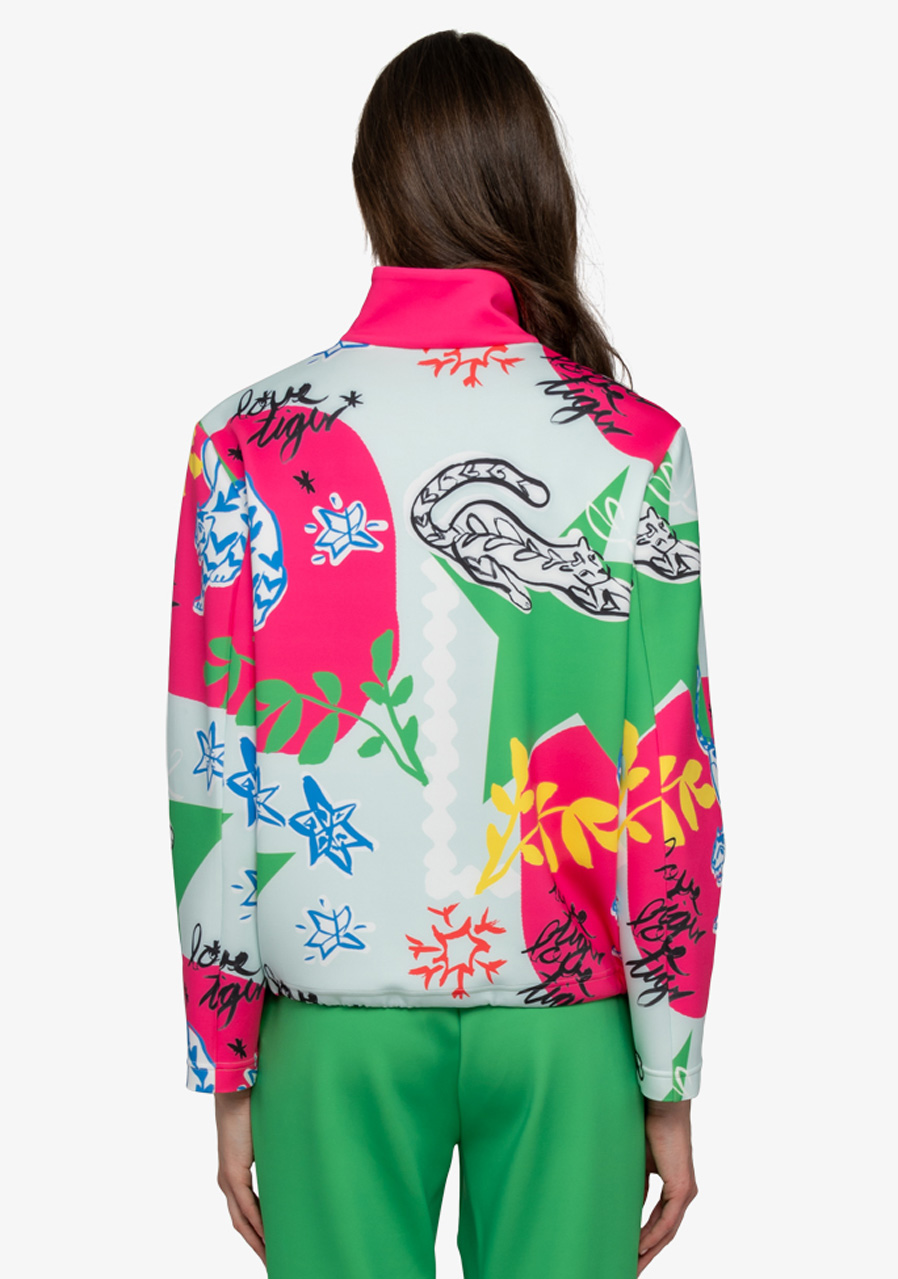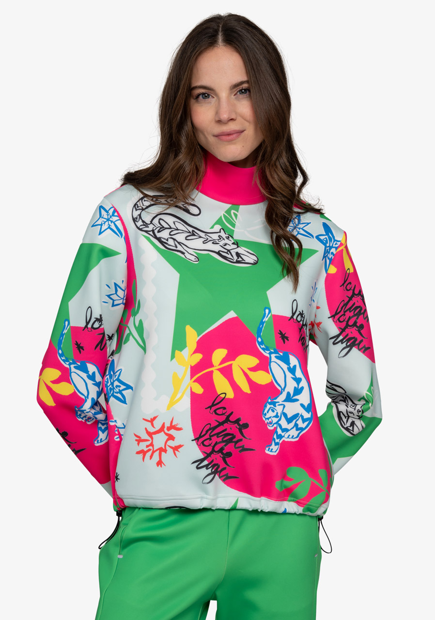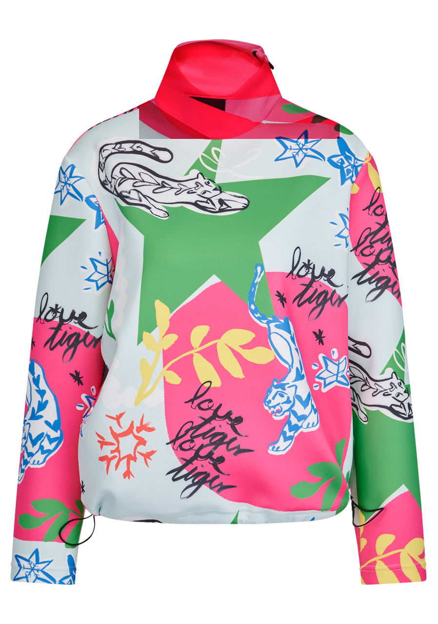 Tato dámská barevná mikina Sportalm je vyrobena z měkké potápěčské tkaniny (84 % polyester, 16 % elastan) a zaujme svým výrazným celoplošným potiskem. Její rovný střih a stojatý límeček s překrytým švem a zipem na rameni umožňují pohodlné oblékání a přidávají moderní nádech.