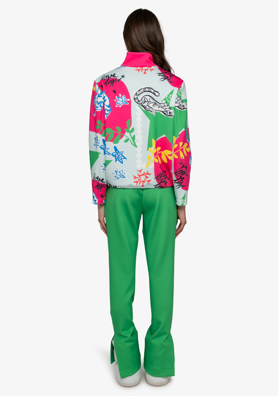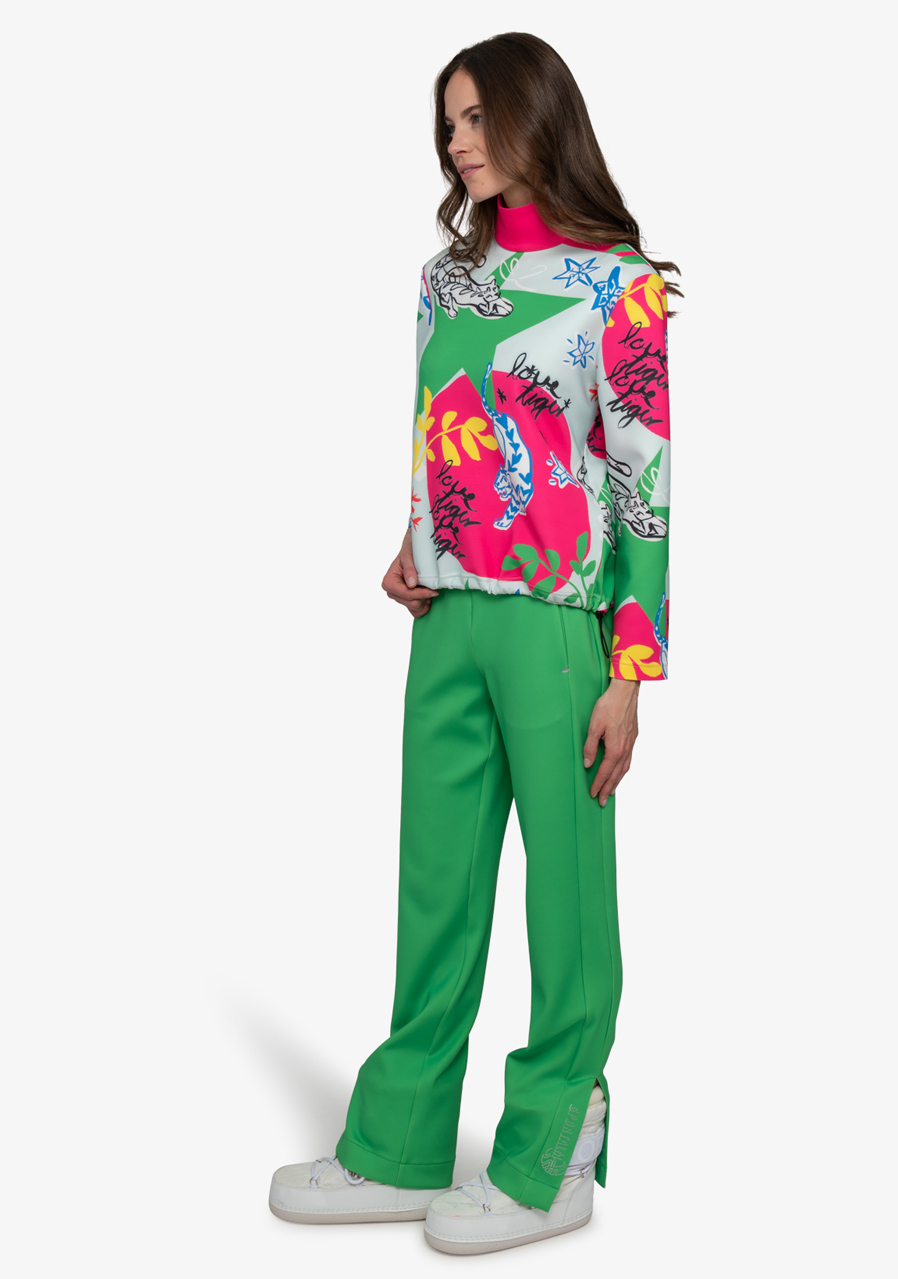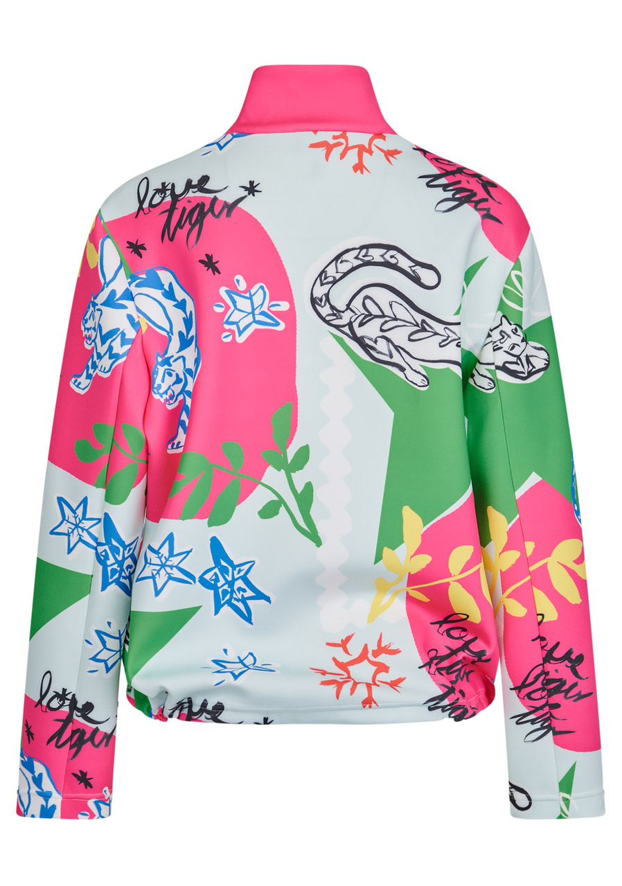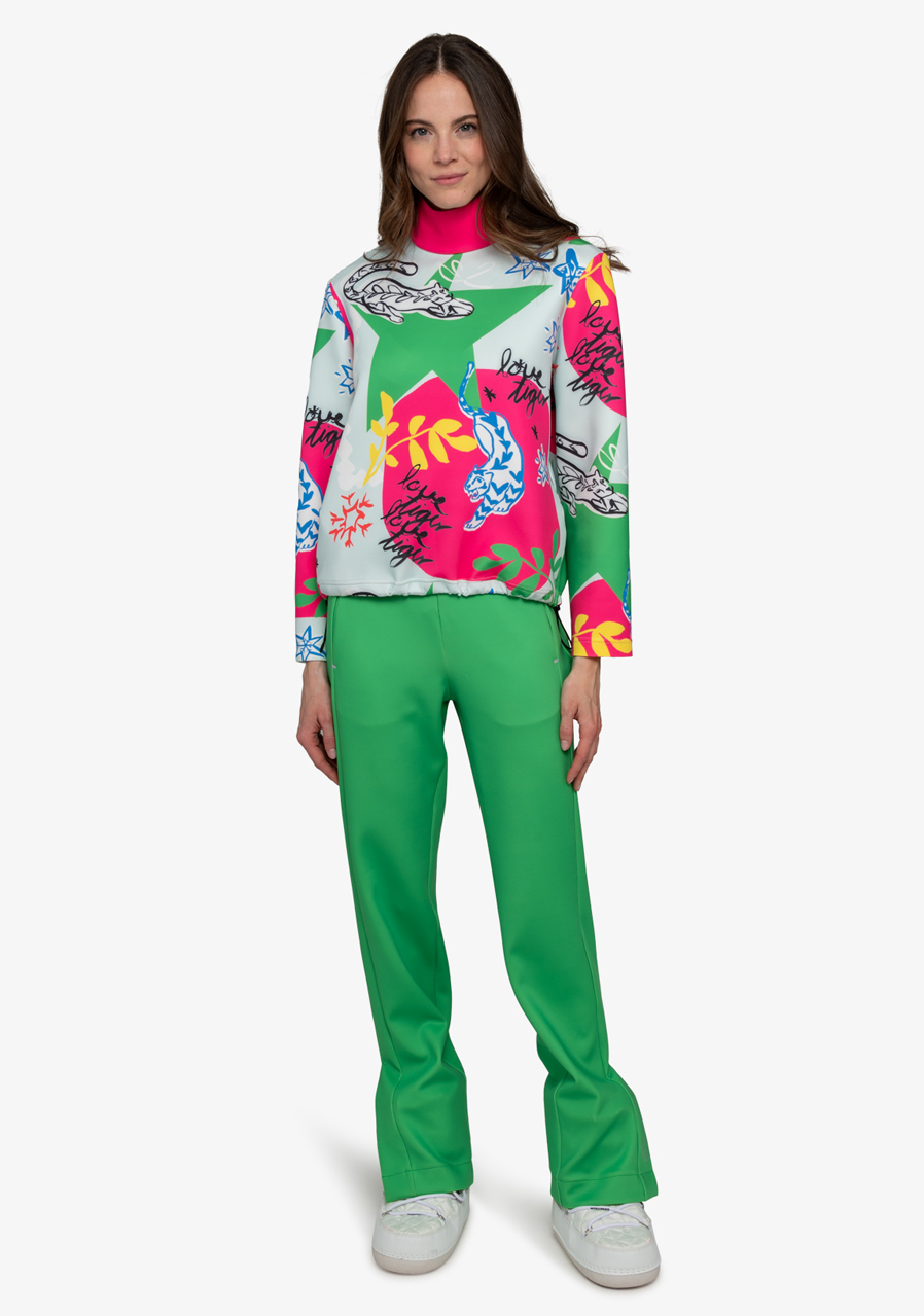Tato dámská barevná mikina Sportalm je vyrobena z měkké potápěčské tkaniny (84 % polyester, 16 % elastan) a zaujme svým výrazným celoplošným potiskem. Její rovný střih a stojatý límeček s překrytým švem a zipem na rameni umožňují pohodlné oblékání a přidávají moderní nádech.