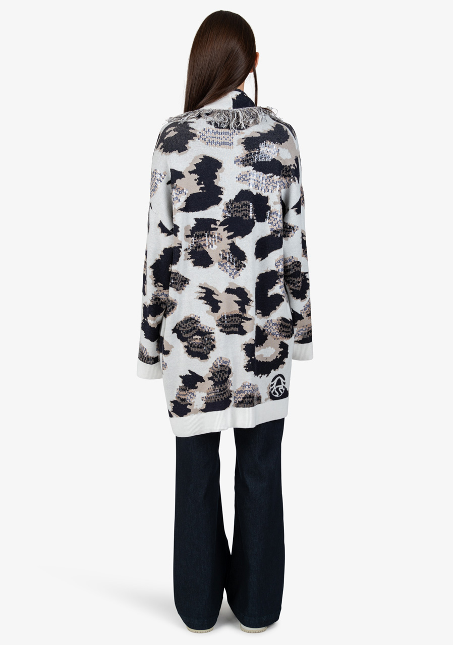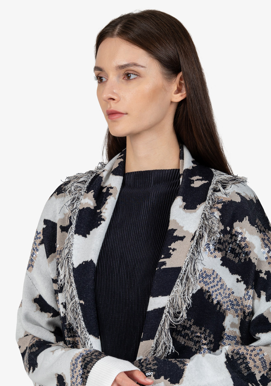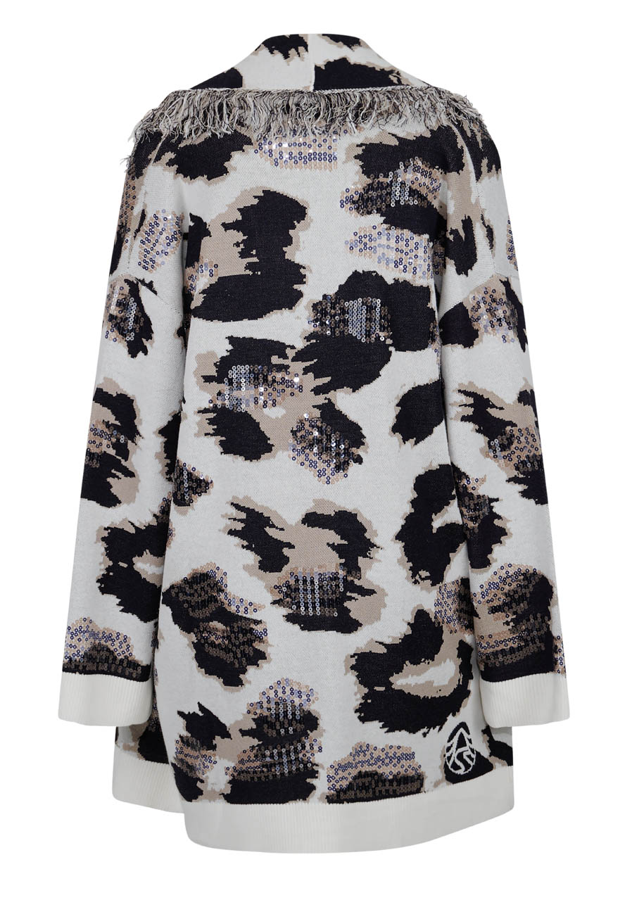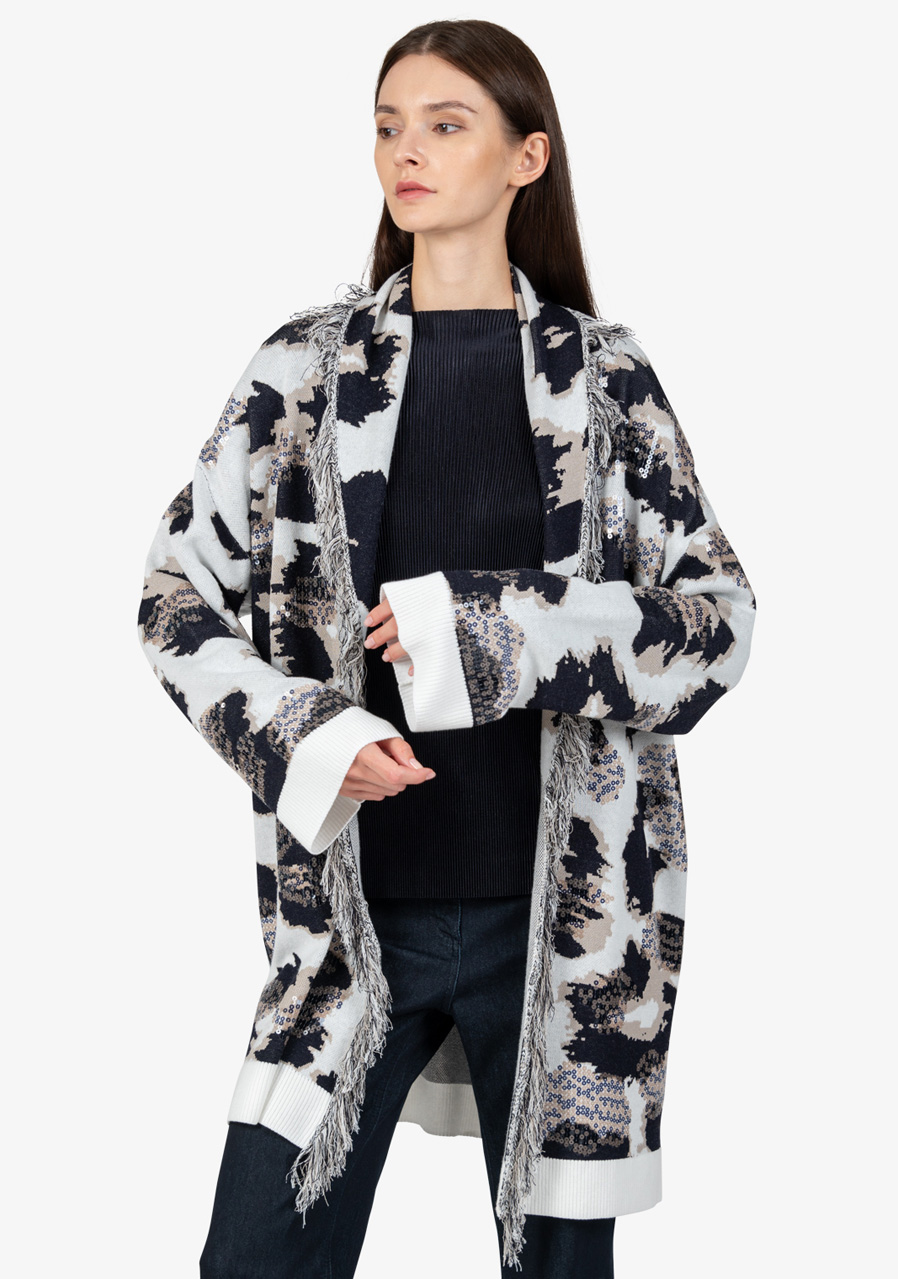 Dámský kabát Sportalm 450147 Eucalyptus Mist je výjimečný pletený kousek s abstraktním leopardím žakárem a propracovanou flitrovou výšivkou. Tento nevšední kabát z jemné bavlny a lesklé viskózy přináší stylový a ženský vzhled, který ocení každá módní nadšenkyně.