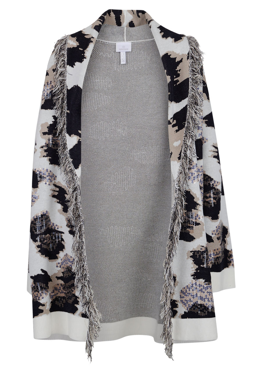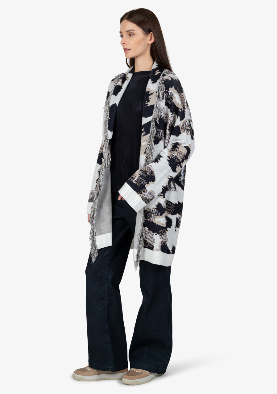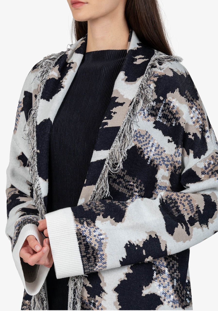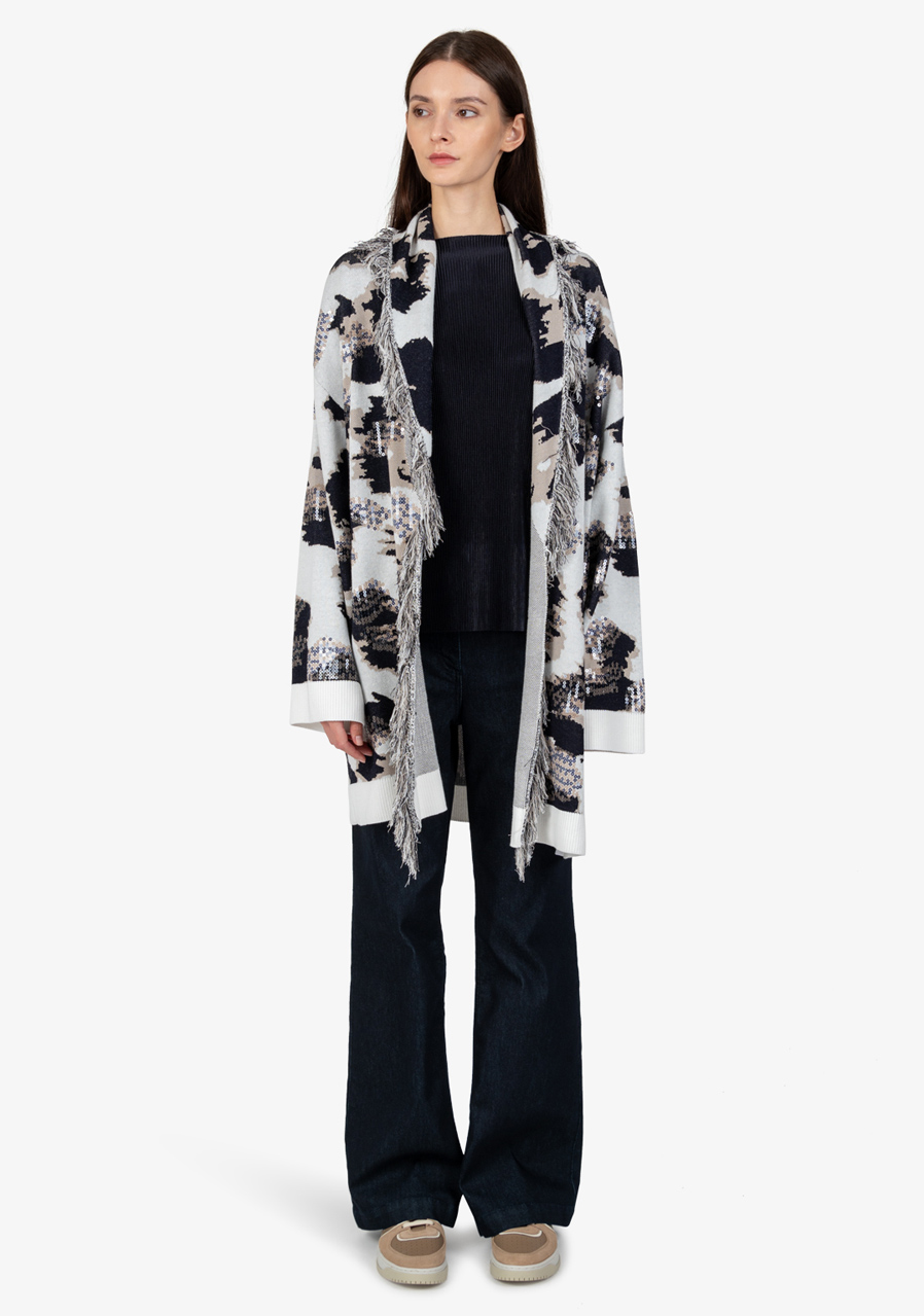 Dámský kabát Sportalm 450147 Eucalyptus Mist je výjimečný pletený kousek s abstraktním leopardím žakárem a propracovanou flitrovou výšivkou. Tento nevšední kabát z jemné bavlny a lesklé viskózy přináší stylový a ženský vzhled, který ocení každá módní nadšenkyně.