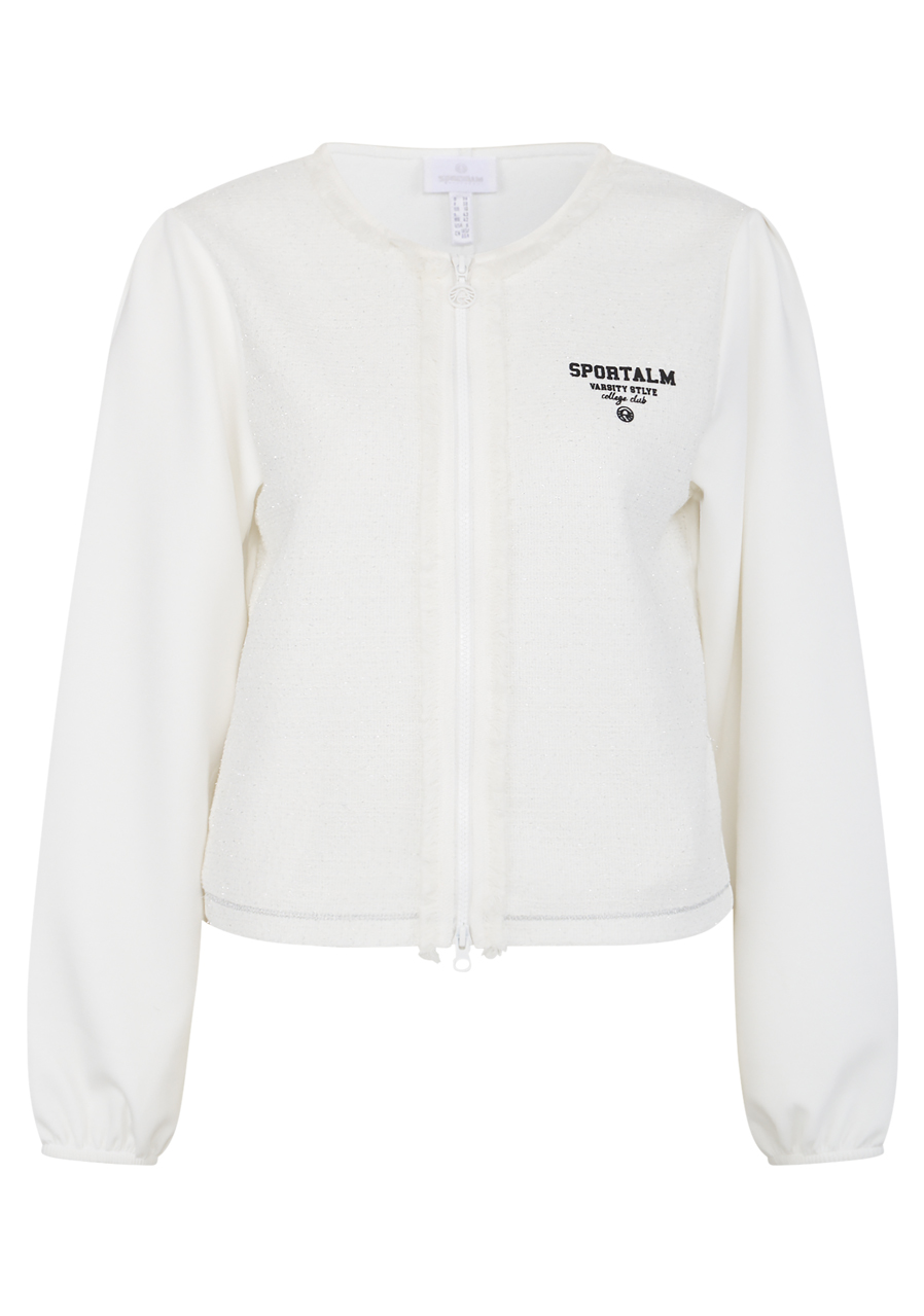 Ďalšie parametre: Rovný strih športovo elegantný štýl okrúhly výstrih so strapcovým lemom rukávy s manžetami a nápisom na prednej strane Zapínanie viditeľný obojsmerný zips zdobený strapcovým lemom na oboch stranách Vrecká bočné vrecká Štýlová mikina ktorá spája pohodlie a originalitu v každom detaile