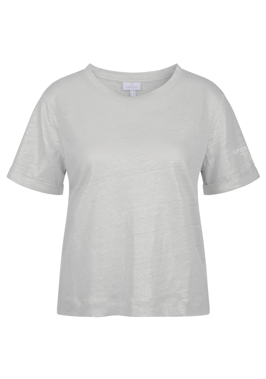 Tričko s kulatým výstřihem s krátkým rukávem je díky lehce třpytivému materiálu skutečným poutačem. Kombinuje nadčasovou eleganci s nádechem glamouru a je všestranná pro různé příležitosti.