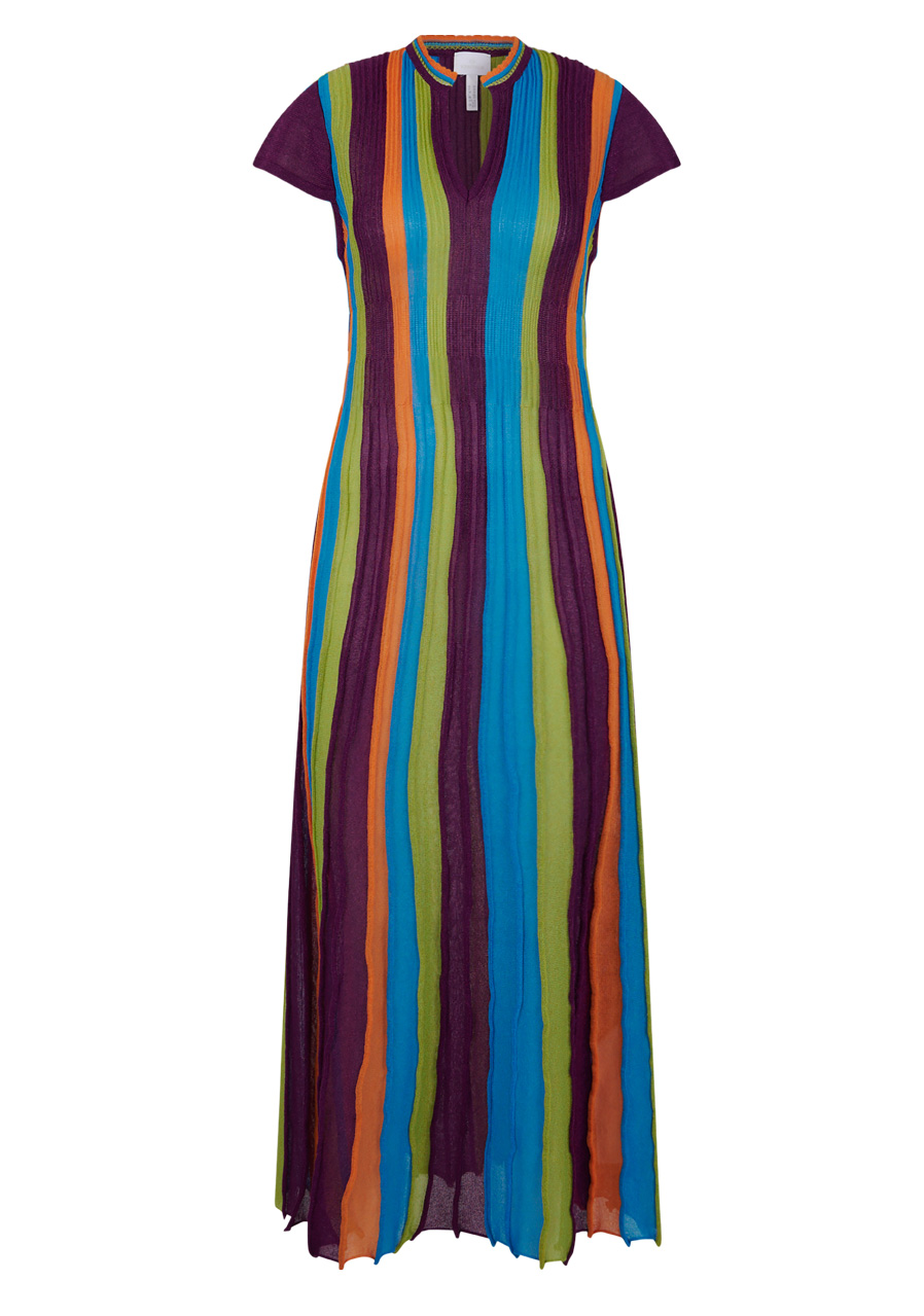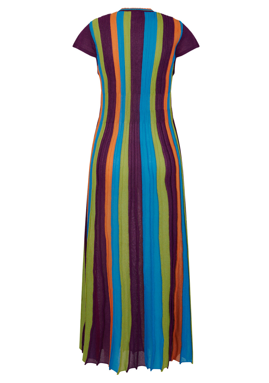 Dámské šaty Sportalm 550178 v odstínu Glazed Grape představují elegantní spojení ženskosti a moderního designu. Tyto pletené šaty zaujmou inovativním žakárovým úpletem s pruhovaným vzorem, který dodává outfitu jedinečný stylový nádech.