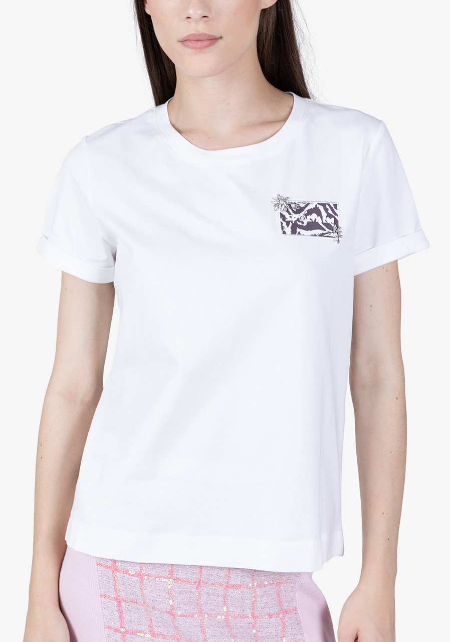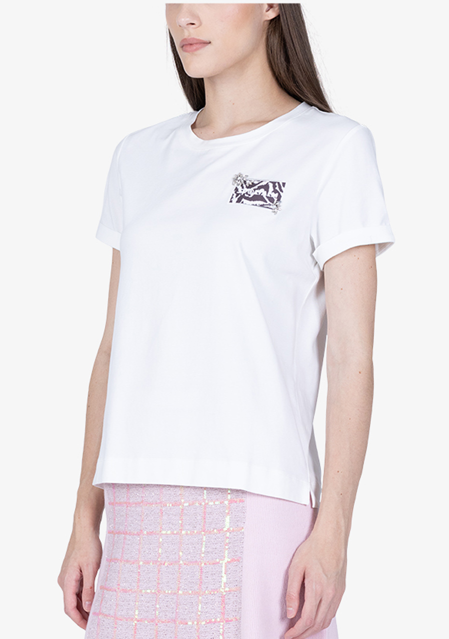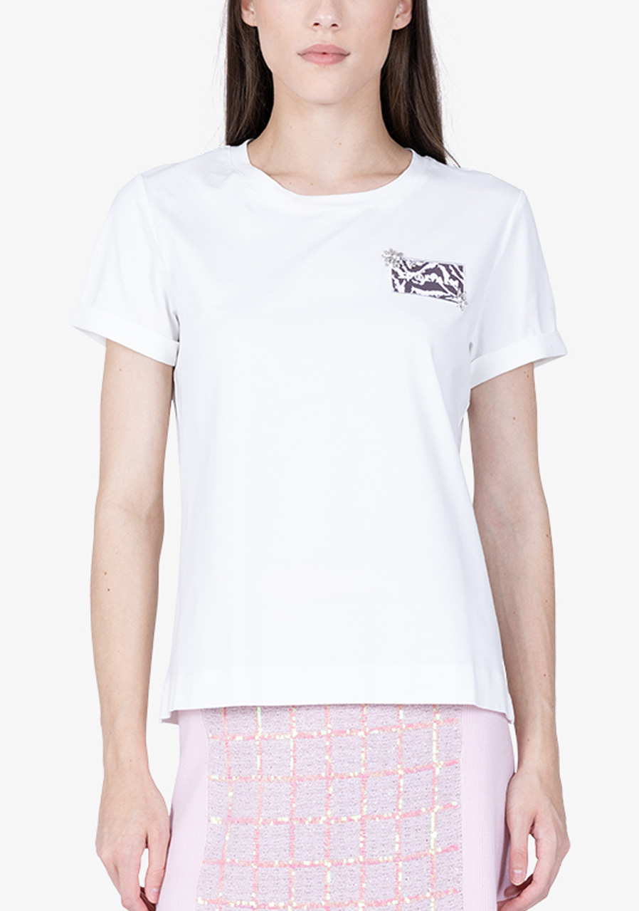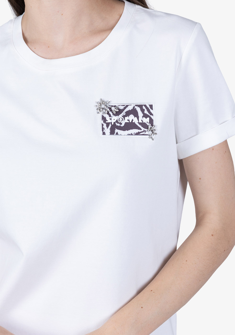 Ležérne tričko, ktoré sa ľahko stane základom každodenného šatníka. Príjemný bavlnený single jersey s elastanom ponúka komfort pri nosení, zatiaľ čo ľahko priliehavý strih pôsobí ženským a moderným dojmom. Hlavnou dominantou je prepracovaný saténový badge na prednej strane s 3D silikónovou potlačou a dekoratívnymi kamienkami, ktorý dodáva tričku výrazný módny akcent. Skvele sa kombinuje s džínsami aj športovo ladenými outfitmi.
