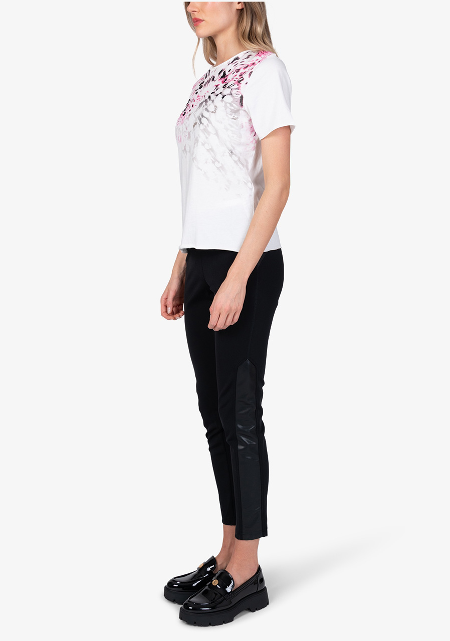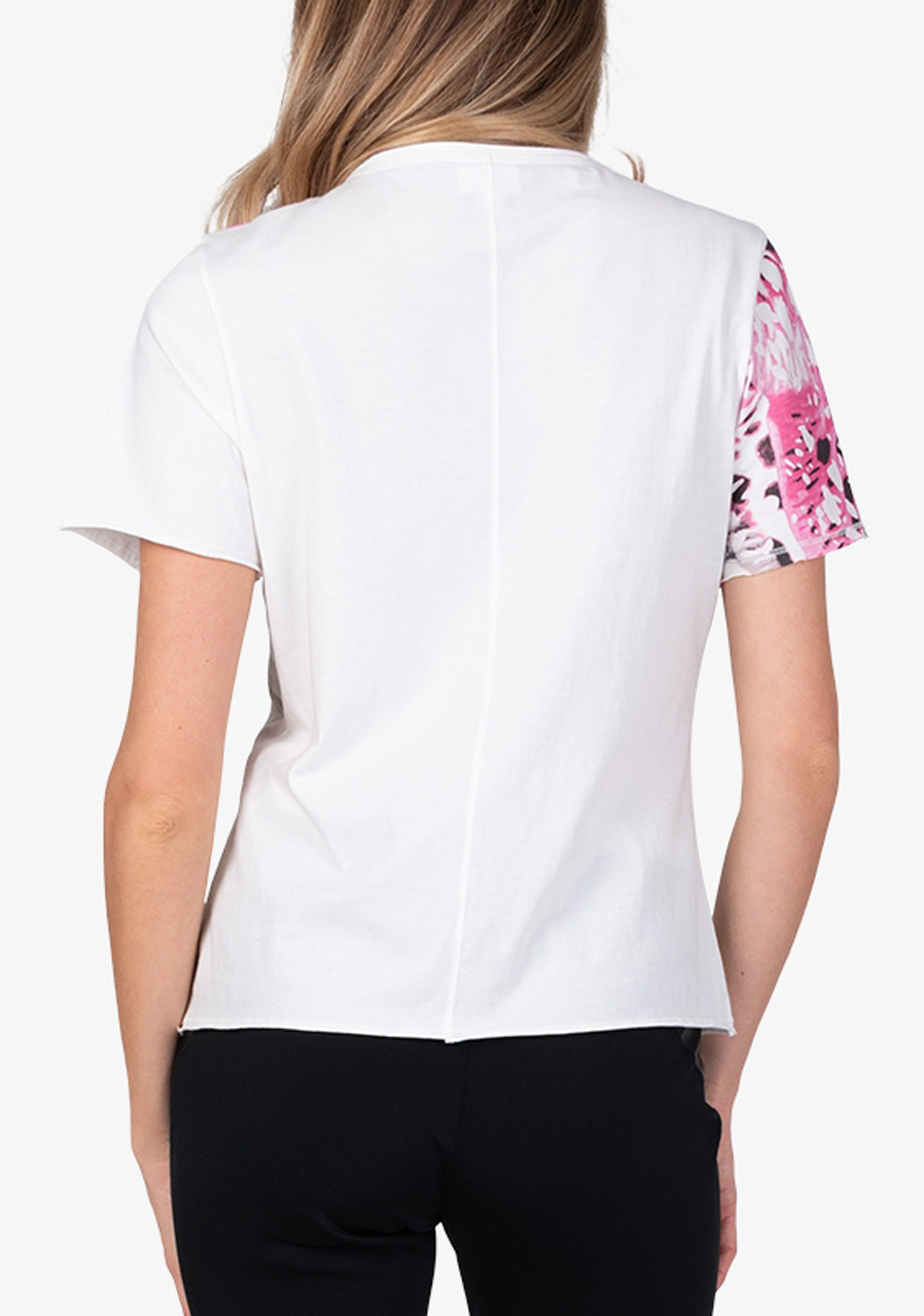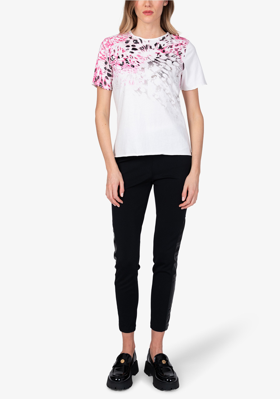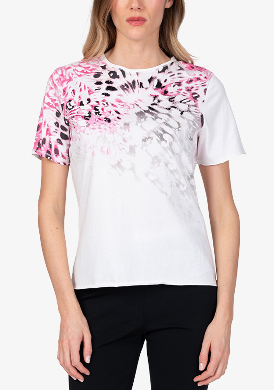 Štýlové tričko s okrúhlym výstrihom zaujme modernou abstraktnou potlačou, ktorá je doplnená dekoratívnymi prvkami na prednej strane a ľavom rukáve. Čistý dizajn v kombinácii s ľahko priliehavým strihom vytvára nadčasový, ženský vzhľad vhodný na každodenné nosenie. Príjemný bavlnený materiál zaisťuje komfort po celý deň a ľahké kombinovanie s ďalšími kúskami šatníka. Typickým znakom je módny rukopis značky Sportalm.