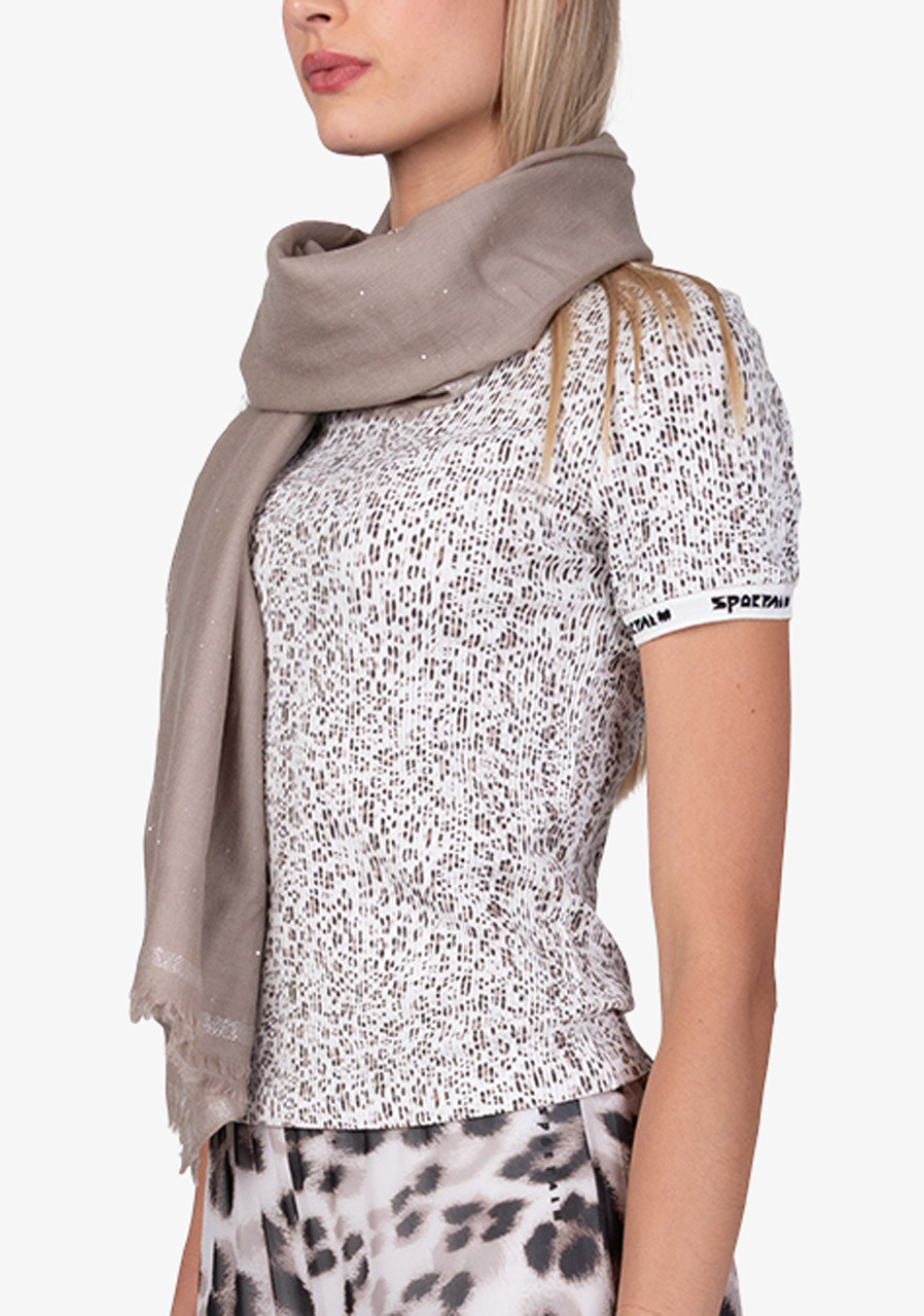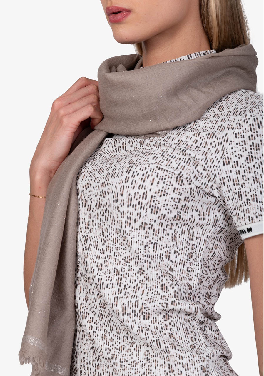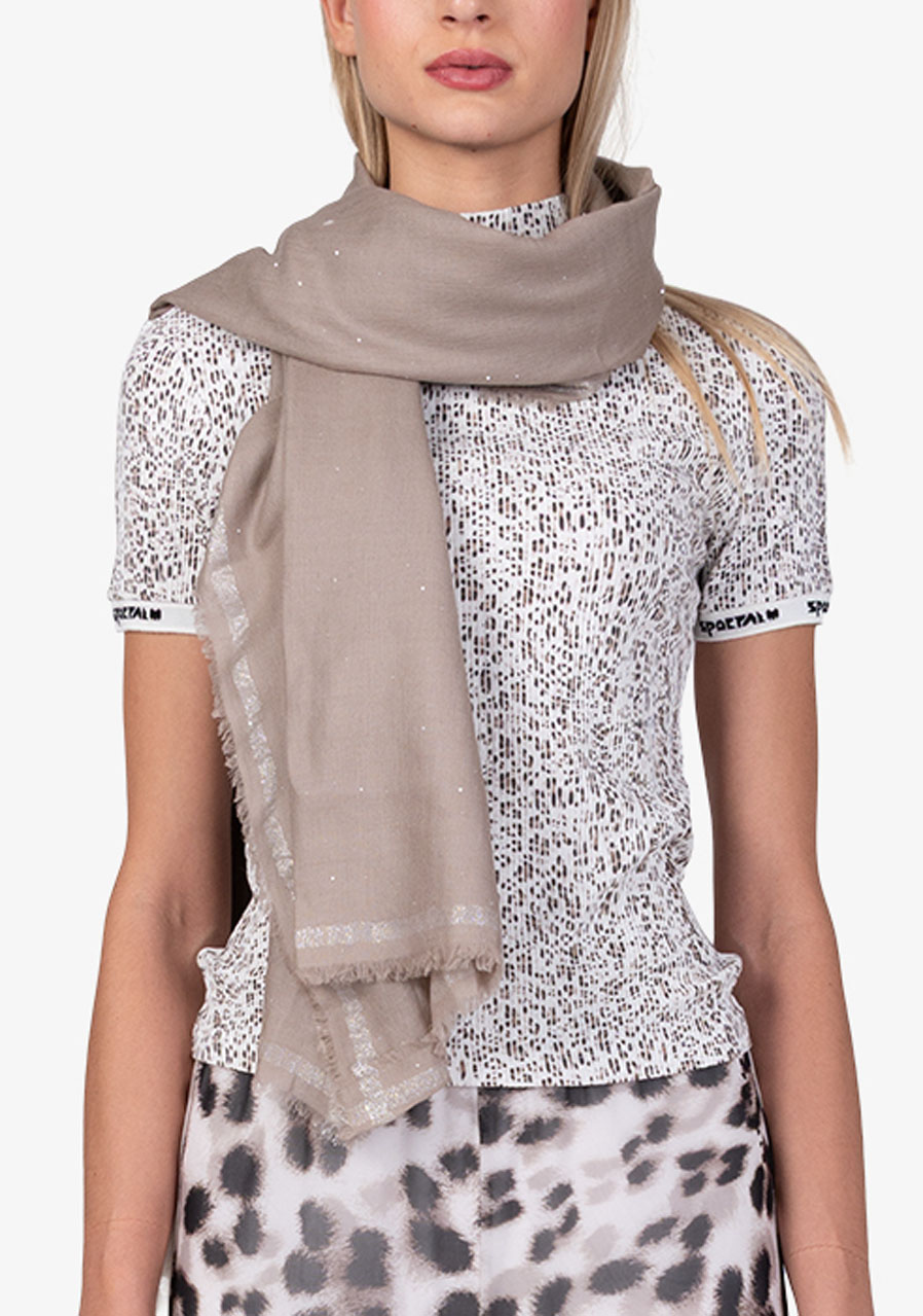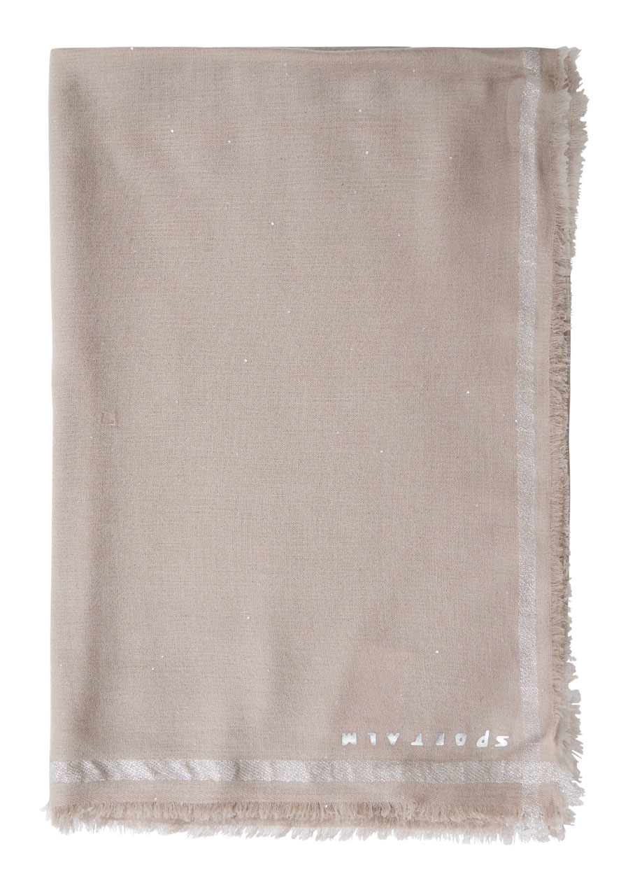 Elegantný šál zaujme jemným ligotom drobných flitrov a kontrastnými lurexovými pruhmi, ktoré dodávajú celkovému vzhľadu sofistikovaný akcent. Ľahký, kvalitný materiál pôsobí luxusne a je príjemný na nosenie. Štýl dopĺňa decentná fóliová potlač s nápisom Sportalm a strapce na okrajoch, ktoré šále prepožičiavajú nadčasový, elegantný charakter.