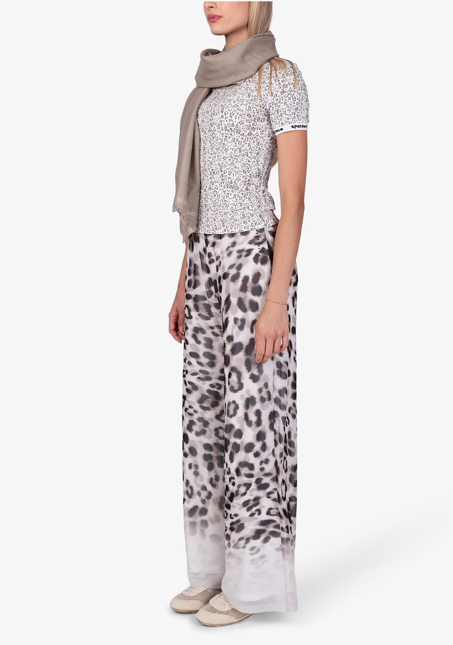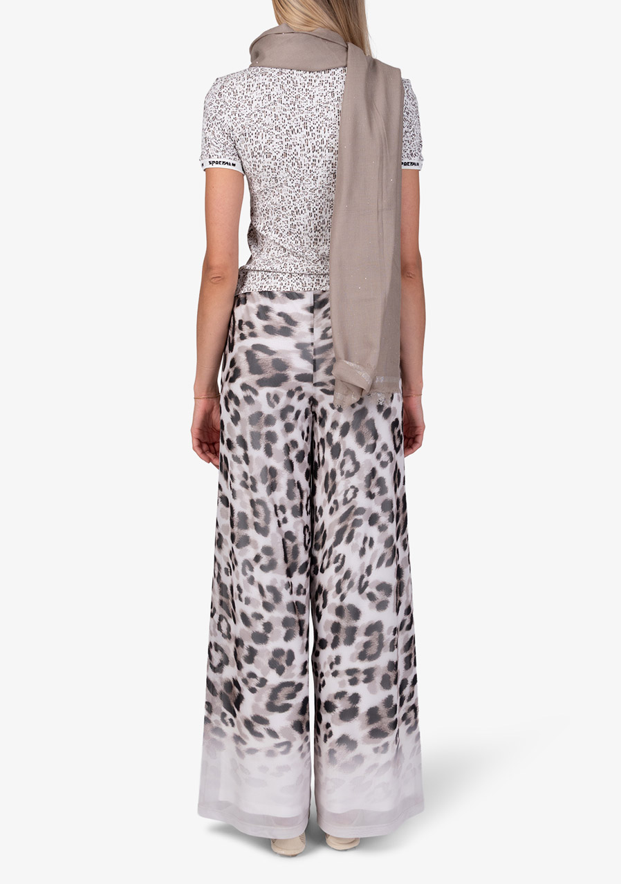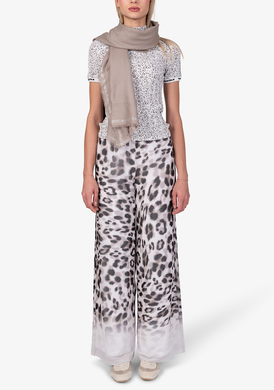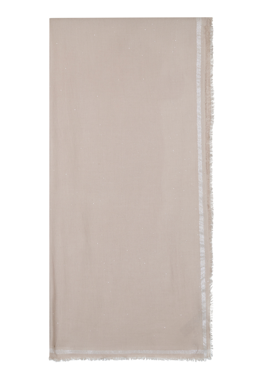 Elegantný šál zaujme jemným ligotom drobných flitrov a kontrastnými lurexovými pruhmi, ktoré dodávajú celkovému vzhľadu sofistikovaný akcent. Ľahký, kvalitný materiál pôsobí luxusne a je príjemný na nosenie. Štýl dopĺňa decentná fóliová potlač s nápisom Sportalm a strapce na okrajoch, ktoré šále prepožičiavajú nadčasový, elegantný charakter.