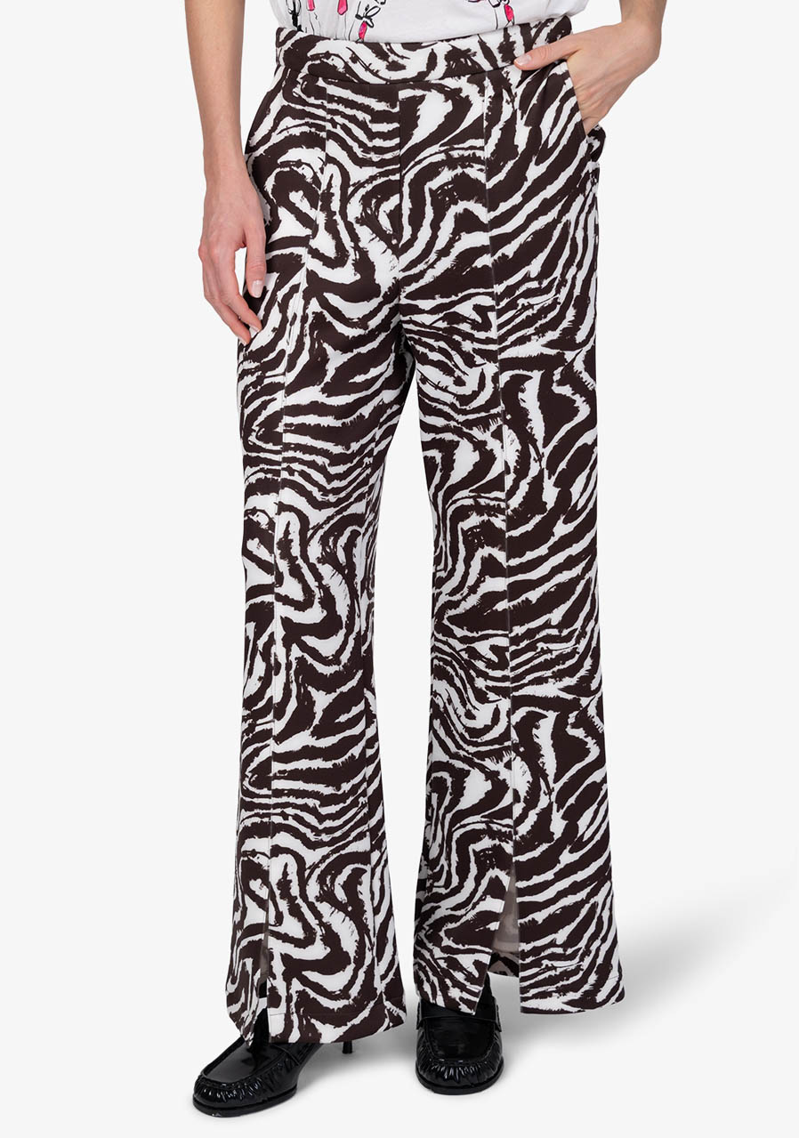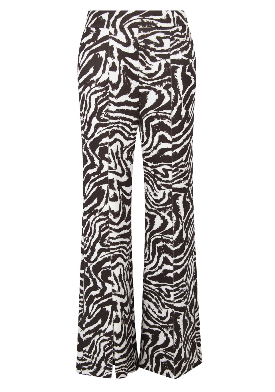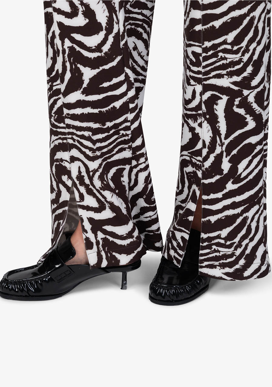 Tieto elegantné bavlnené nohavice v slip-on prevedení zaujmú nadčasovým dizajnom a ženskou siluetou. Príjemná scuba kvalita poskytuje komfort pri nosení a zároveň drží tvar. Rovné nohavice s krátkymi rázporkami v prednej časti pôsobia ľahko a sofistikovane, zatiaľ čo zebrí vzor dodáva modelu výrazný, módny akcent. Kombinácia klasického pása vpredu a pružného pása v zadnej časti zaisťuje pohodlie aj elegantný vzhľad - typický rukopis značky Sportalm.