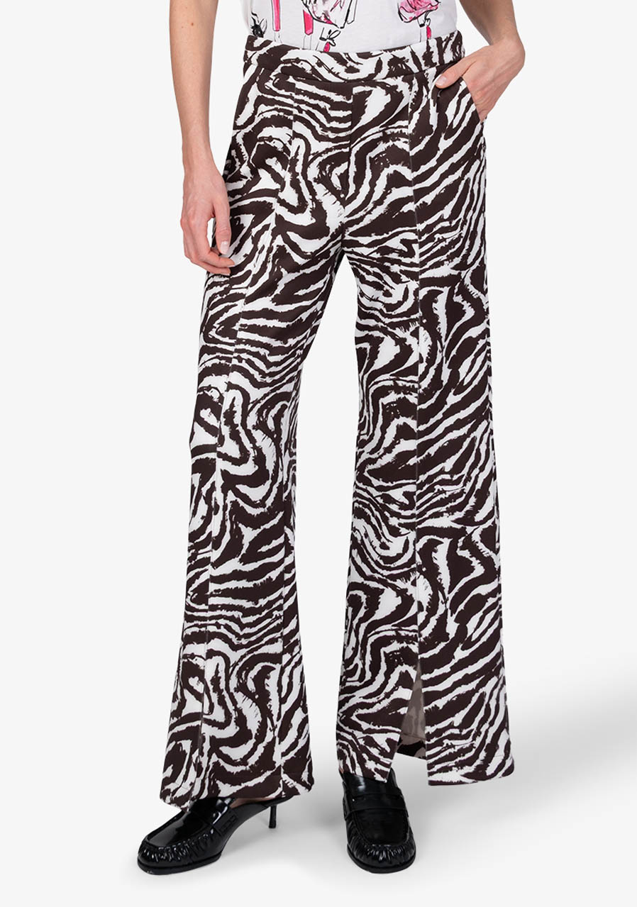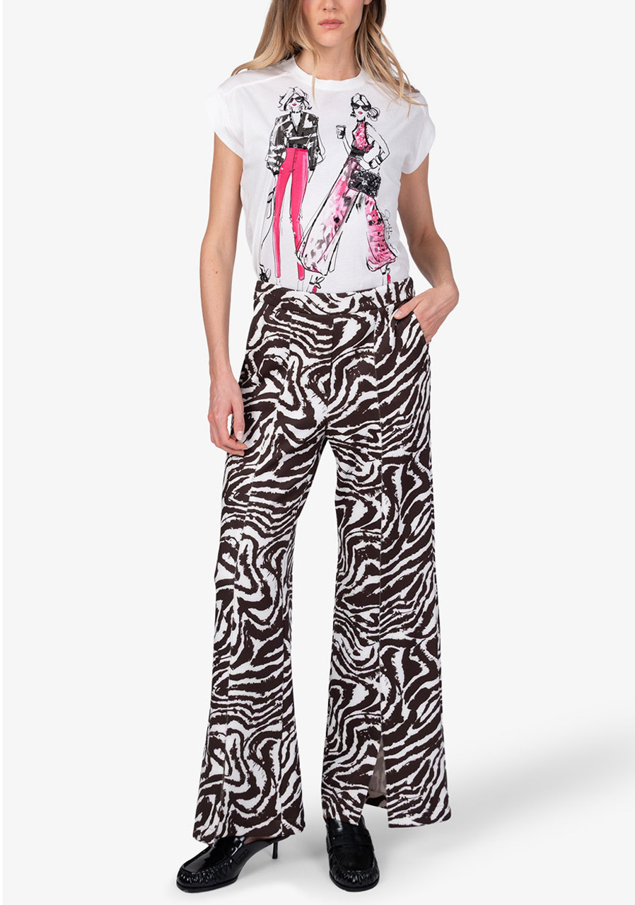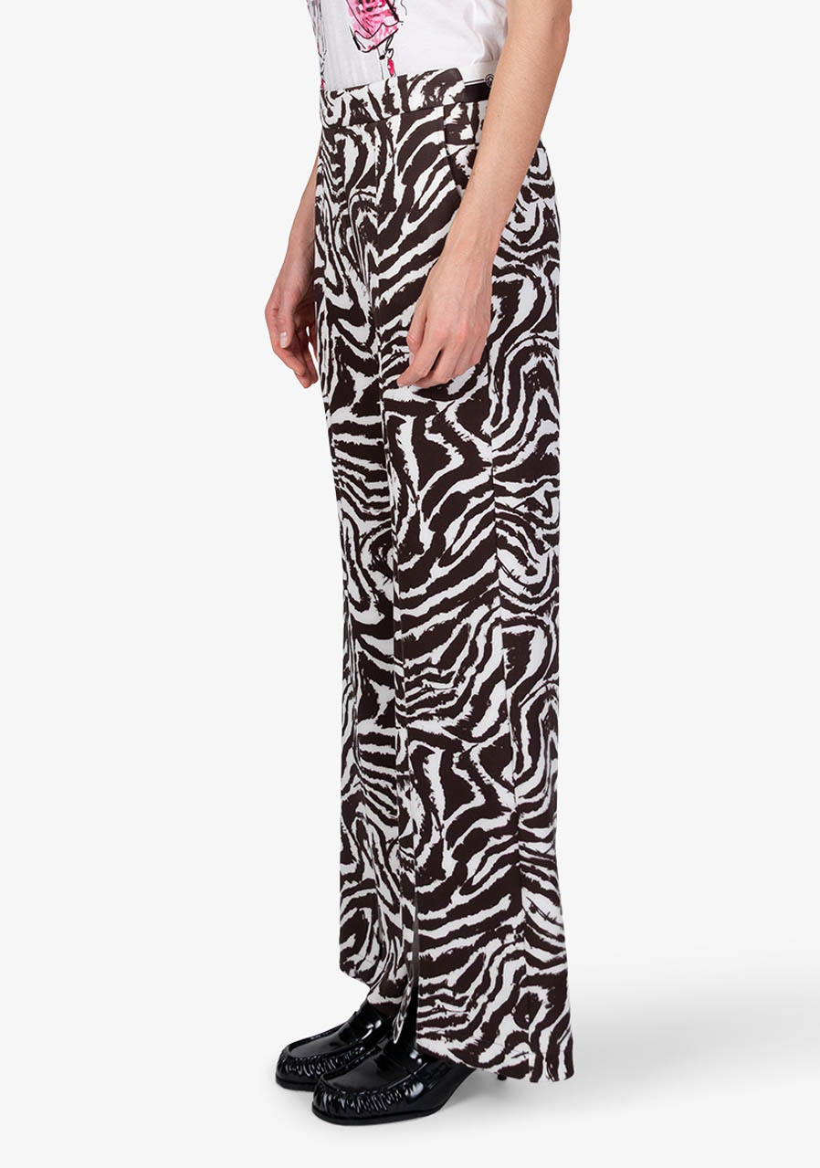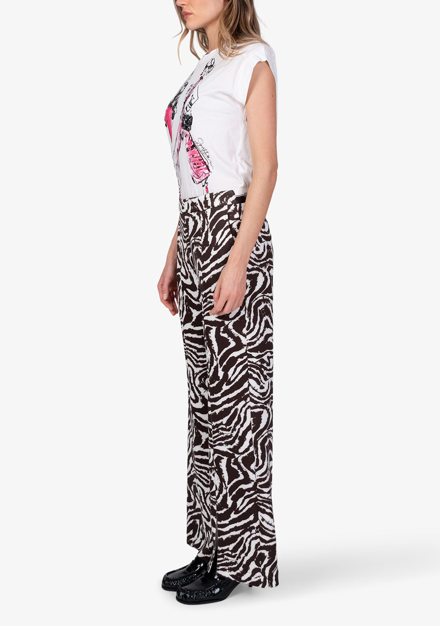 Tieto elegantné bavlnené nohavice v slip-on prevedení zaujmú nadčasovým dizajnom a ženskou siluetou. Príjemná scuba kvalita poskytuje komfort pri nosení a zároveň drží tvar. Rovné nohavice s krátkymi rázporkami v prednej časti pôsobia ľahko a sofistikovane, zatiaľ čo zebrí vzor dodáva modelu výrazný, módny akcent. Kombinácia klasického pása vpredu a pružného pása v zadnej časti zaisťuje pohodlie aj elegantný vzhľad - typický rukopis značky Sportalm.