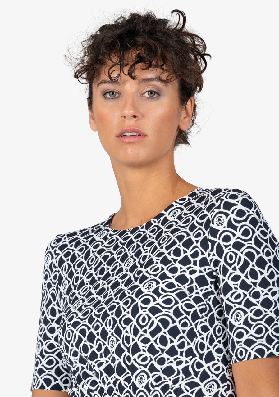 Další parametry: Vyrobené z kvalitního žerzeje s úpletem, tyto šaty skvěle padnou a poskytují pohodlí během celého dne. Kulatý výstřih s vysokým límcem přidává šatům šmrnc, zatímco krátké rukávy a skrytý zip na zadní straně přidávají na eleganci a praktičnosti. Strečová sukně s otevřenými okraji zvýrazňuje ženskou siluetu, zatímco technicky řešené nabírání vpředu dodává šatům zajímavý a moderní vzhled.