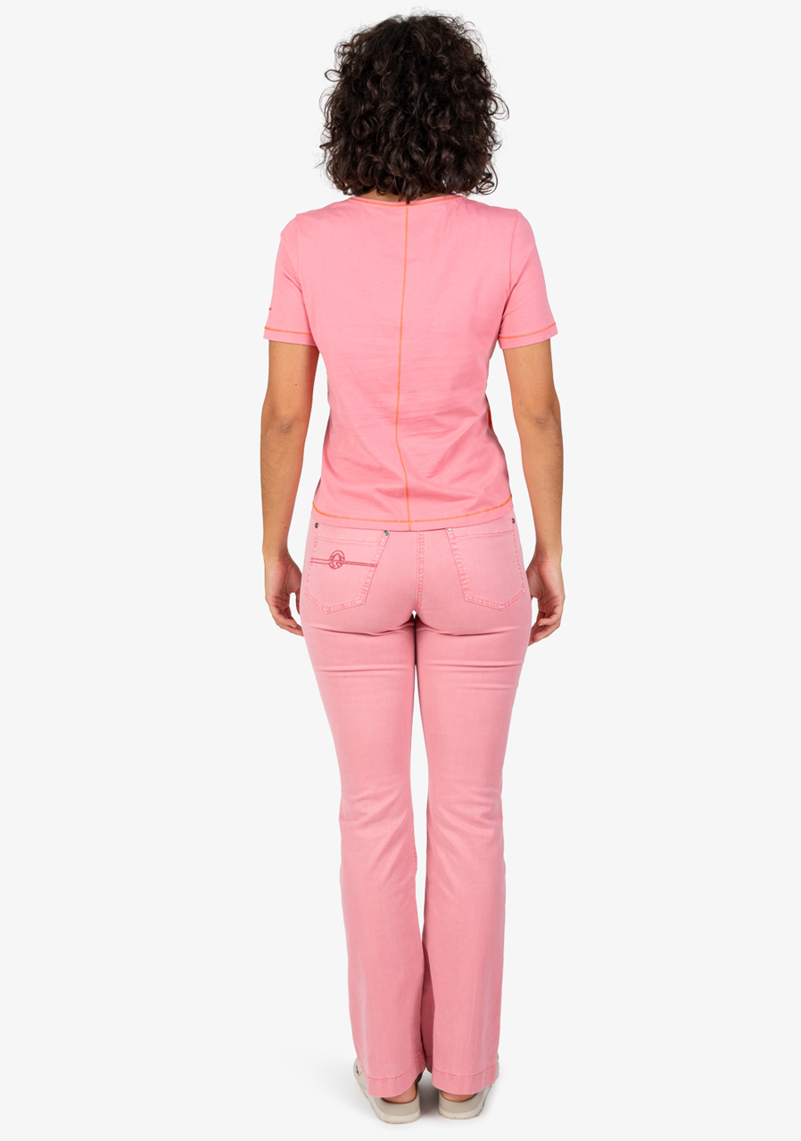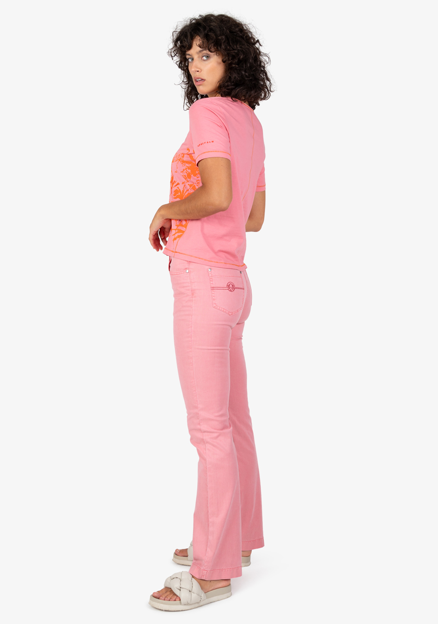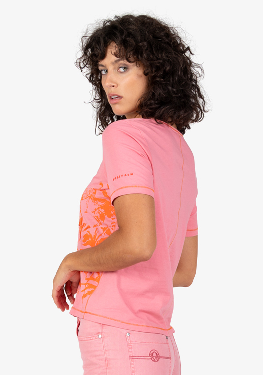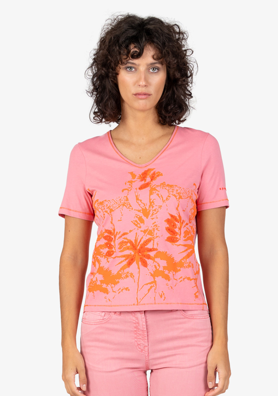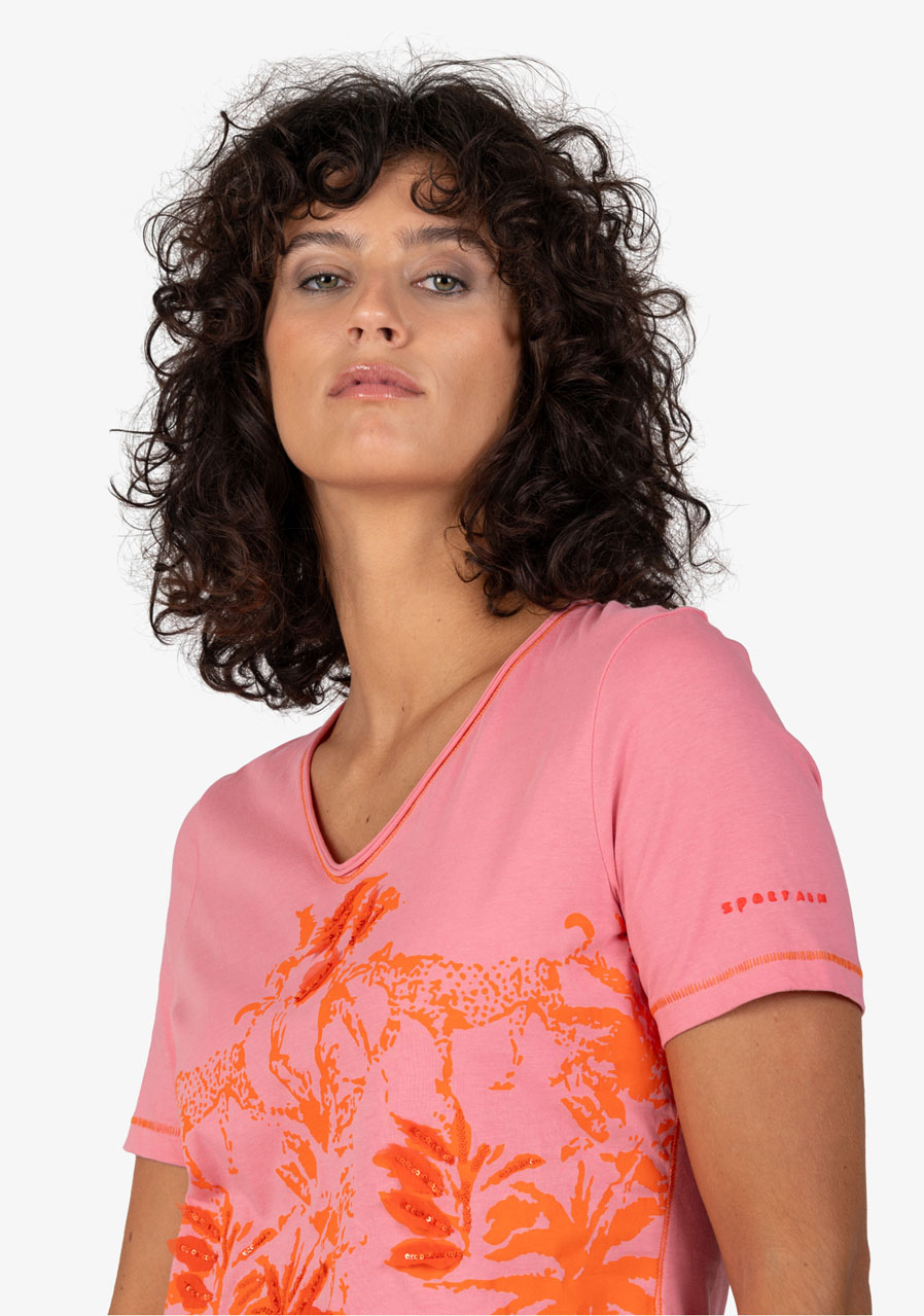Dámské tričko Sportalm 250165 Pink Dawn je ideální letní kousek s výrazným džunglovým potiskem, který vás přenese přímo do tropických dnů. Je vyrobeno z měkkého bavlněného žerzeje a zdobí ho šifonové aplikace a flitry na přední straně, což dodává triku stylový a moderní vzhled.